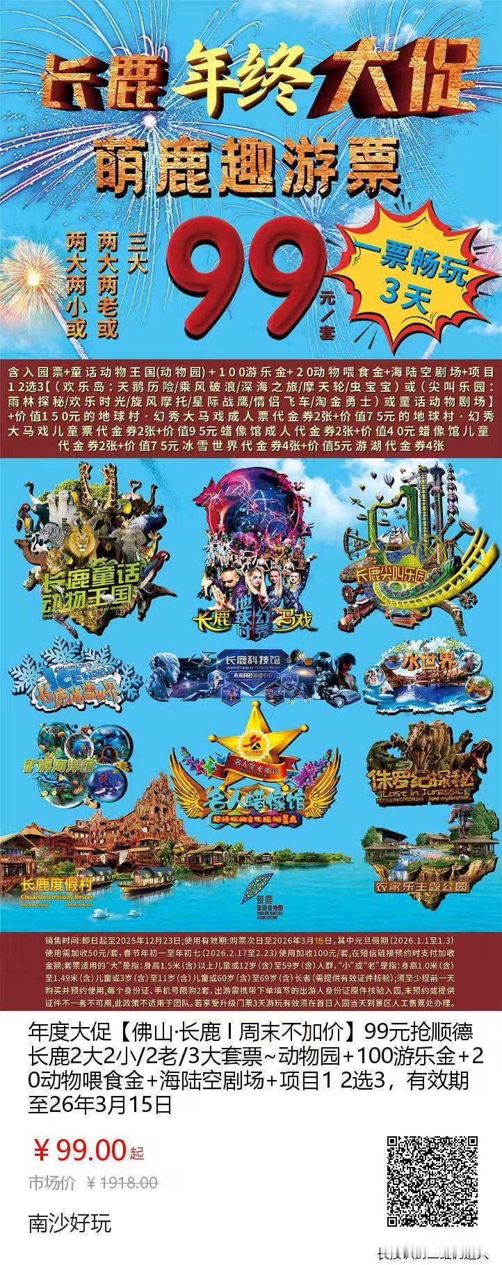 南沙人的长隆!长鹿又搞活动了,“2大2小”或“3大”只要99元,还是送游乐金、喂食金还有多个项目的代金券。南沙过去只要一个小时车程。 有效期长,一直到明年3月份都可以用,快点撸起来吧,错过等一年!