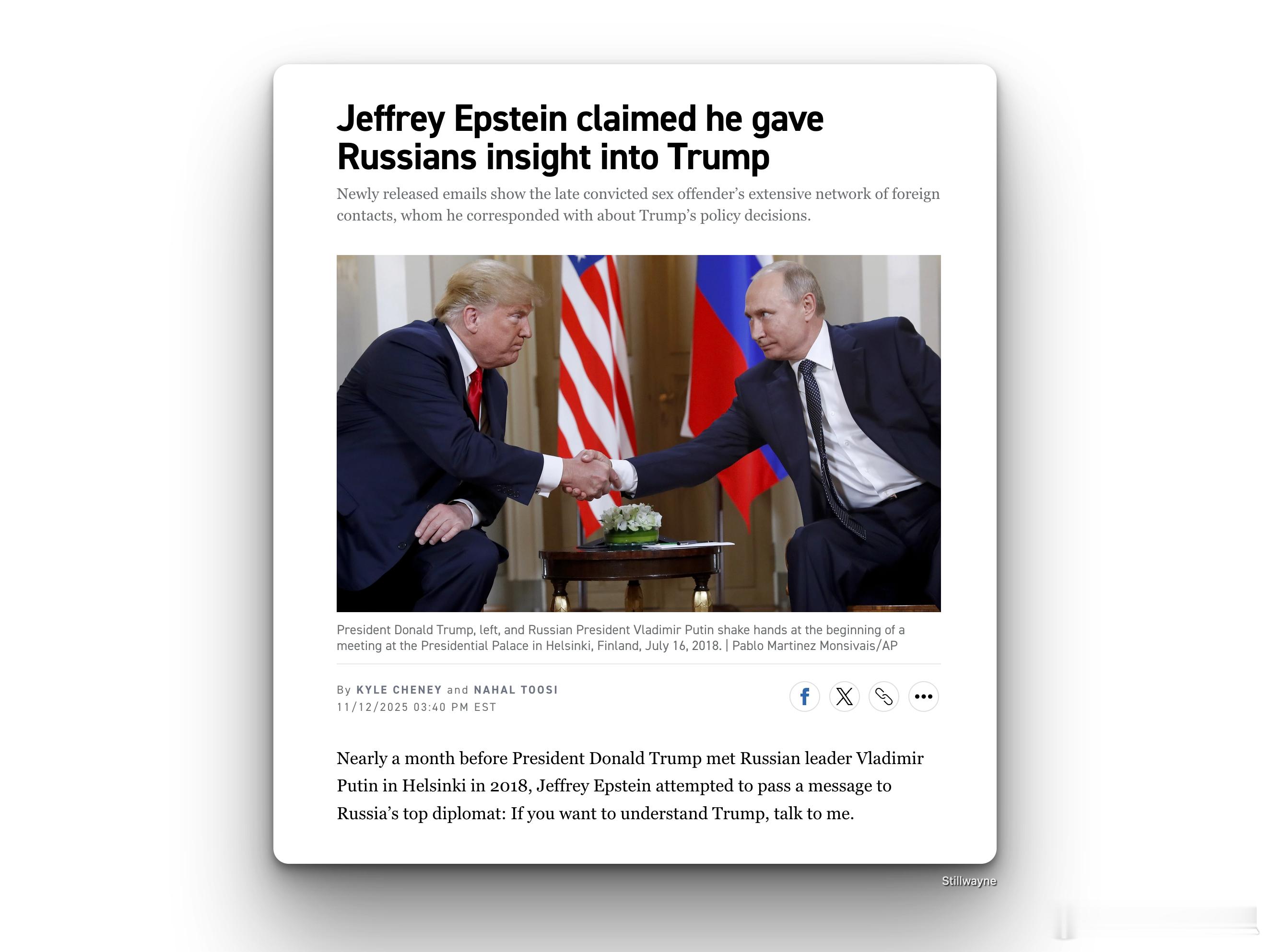 爱泼斯坦向俄罗斯人提供了有关特朗普的信息2018 年,在特朗普与普京在赫尔辛基会面近一个月前,爱泼斯坦试图向俄罗斯最高外交官传递一个信息:如果你想了解特朗普,就和我谈谈。“我认为你可以建议普京,让拉夫罗夫通过和我谈谈来获取一些信息,”爱泼斯坦在2018年6月24日发给托尔比约恩·亚格兰的电子邮件中写道。亚格兰是挪威前首相,当时担任欧洲委员会主席。邮件中的拉夫罗夫显然指的是俄罗斯长期担任外交部长的谢尔盖·拉夫罗夫。其中一封显示,爱泼斯坦曾表示,在俄罗斯驻联合国大使维塔利·丘尔金于2017 年去世之前,他曾与丘尔金谈论过特朗普。拉里·萨默斯在 2018 年 7 月 16 日(也就是特朗普与普京在赫尔辛基举行峰会当天)在发给爱泼斯坦的电子邮件中写道:“俄罗斯人掌握了特朗普的把柄吗?” 爱泼斯坦回复说:“今天的表现糟糕透顶,哪怕以他的标准来看。...我的邮箱里也充满了类似的评论。哇。我敢肯定他认为会议进展得非常顺利,觉得自己已经迷倒了对手……但显然他完全不了解其中的象征意义。其实他对大多数事情都一无所知。”