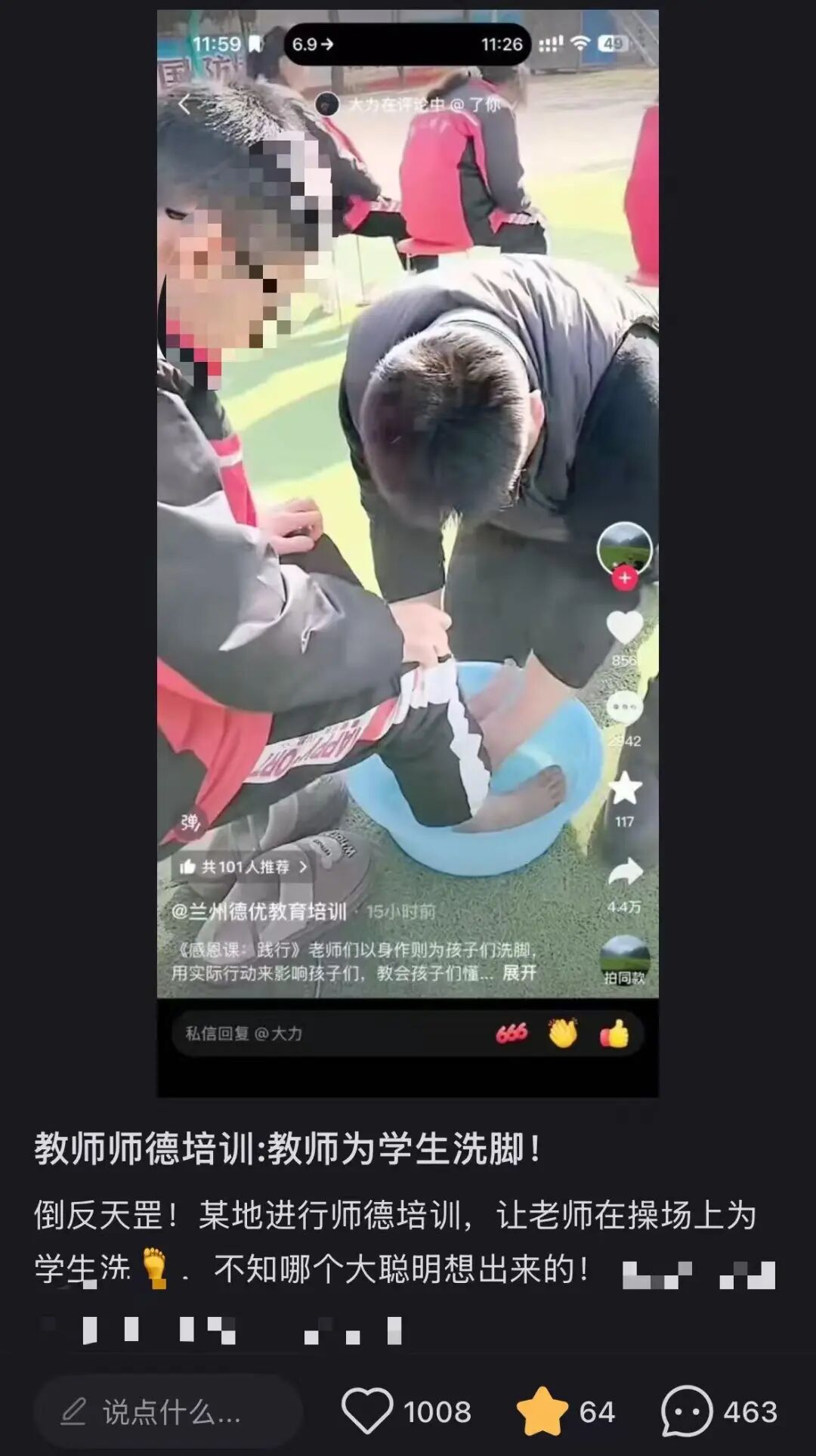 近日,有网友发帖称,兰州一教育机构发布了一条老师在操场上给学生洗脚的视频,此举引发较大争议,有网友认为学校此举不尊重老师。根据网友所发视频截图,发布“洗脚”视频的账号为兰州德优教育培训。