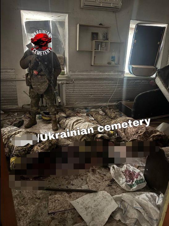 图片显示三名疑似乌克兰无人机操作员身穿迷彩服,躺在血迹斑斑的房间里,图片上叠加着“乌克兰公墓”等嘲讽文字。据称,这张图片来自俄罗斯军队在顿涅茨克州波克罗夫斯克附近的前线城镇米尔诺赫拉德处决俘虏的画面,俄罗斯士兵活捉了一支乌克兰无人机小组,随后似乎将他们处决了。当时正值俄罗斯2025年11月的攻势期间。 米尔诺赫拉德位于争议地区,自11月初以来,俄罗斯的推进力度不断加大。双方都大量使用第一人称视角(FPV)无人机进行打击,导致乌克兰无人机造成平民伤亡,并导致被俘操作员遭到相应的残酷对待,正如近期ISW评估报告所指出的那样。