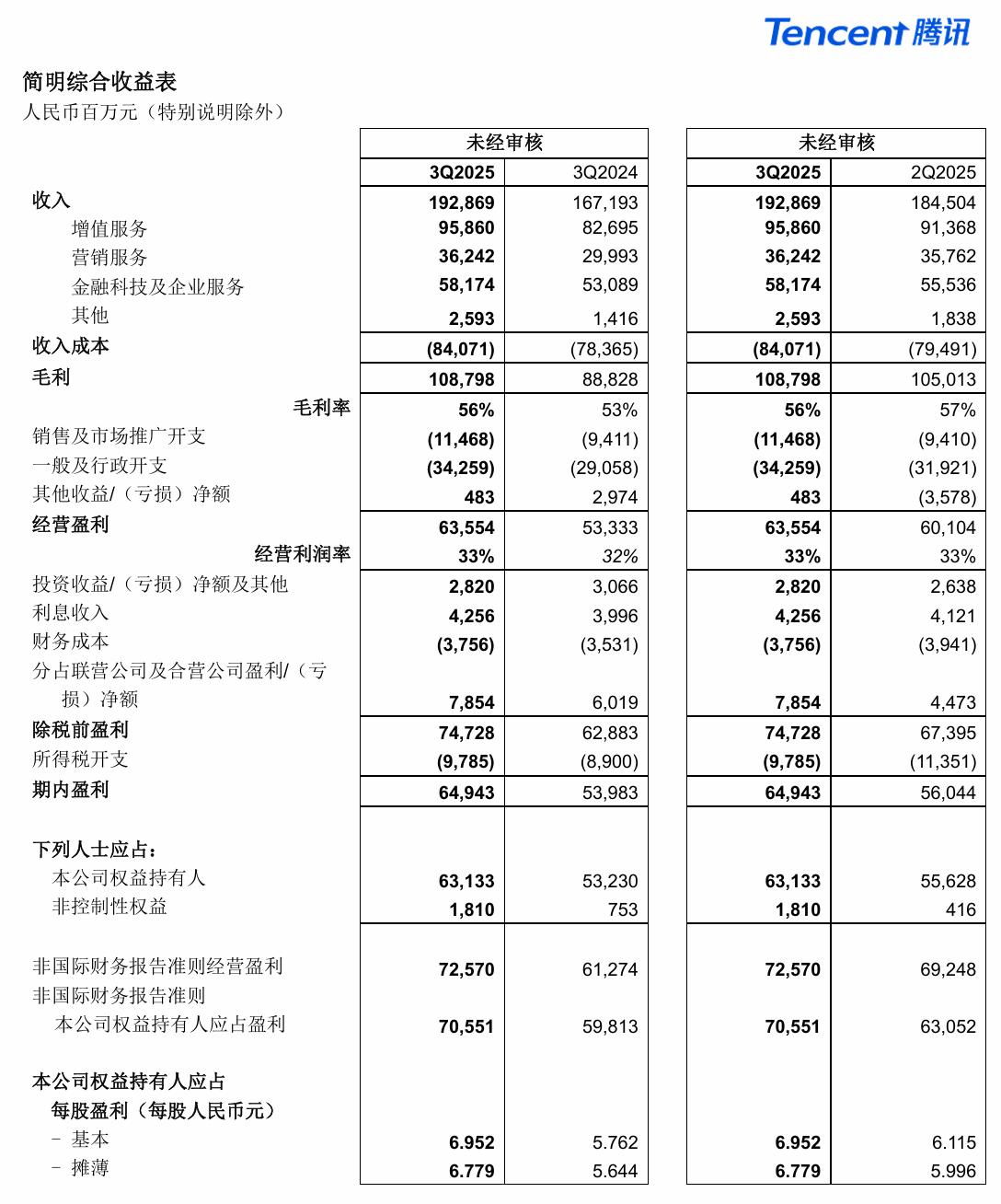 腾讯2025年Q3营收1929亿元,净利润631亿元 总收入同比增长15%至1929亿元。 增值服务业务2025年Q3的收入同比增长16%至959亿元。本土市场游戏收入为428亿元,同比增长15%,主要得益于近期发布的《三角洲行动》等多款游戏的收入贡献,《王者荣耀》与《和平精英》等长青游戏的收入增长,以及《无畏契约》从个人电脑端至移动端的拓展。 国际市场游戏收入为208亿元,同比增长43%(按固定汇率计算为42%),主要得益于Supercell旗下游戏的收入增长。社交网络收入同比增长5%至323亿元,得益于视频号直播服务收入、音乐付费会员收入及小游戏平台服务费的增长。 营销服务业务2025年Q3的收入同比增长21%至362亿元。 金融科技及企业服务业务2025年Q3的收入同比增长10%至582亿元。主要受益于商业支付活动及消费贷款服务的收入增加。 毛利同比增长22%至1088亿元,主要由于若干自研游戏、视频号及微信搜一搜营销服务等高毛利率的收入贡献增加,以及我们的云服务成本效益的提升。毛利率由去年同期的53%提升至56%。 销售及市场推广开支同比增长22%至115亿元。一般及行政开支同比增长18%至342亿元,。 本公司权益持有人应占盈利。2025年Q3的本公司权益持有人应占盈利同比增长19%至631亿元。2025年Q3的非国际财务报告准则本公司权益持有人应占盈利同比增长18%至706亿元。