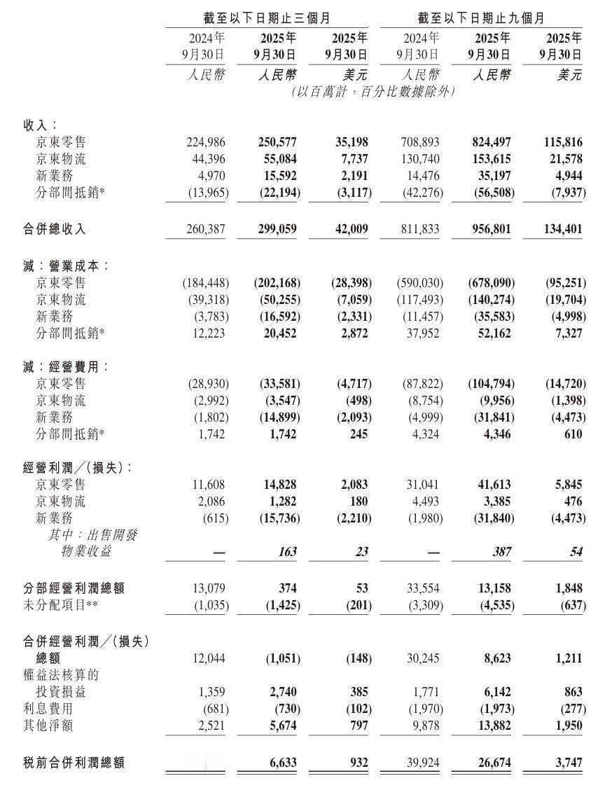 京东2025Q3营收增长14.9%,净利润下滑56.1%,外卖大战增收不增利 Q3收入为2,991亿元,同比增长14.9%。商品收入增加10.5%,服务收入增加30.8%。 营业成本。营业成本由2024年Q3的2,153亿元增加15.4%至的2,486亿元。 履约开支同比增加35.2%至的220亿元。履约开支占收入的百分比,为7.4%,2024年Q3为6.3%,上升1.1个百分点,主要由于本公司持续优化履约能力并加大人力投入以提升用户体验。 营销开支同比增加110.5%至的211亿元。营销开支占收入的百分比,为7.0%,2024年Q3为3.8%,上升3.2个百分点。该增加主要是由于用于新业务推广活动的支出增加。 研发开支同比增加28.4%至的56亿元。研发开支占收入的百分比为1.9%,2024年Q3为1.7%。一般及行政开支同比增加28.6%至的30亿元。一般及行政开支占收入的百分比为1.0%,2024年Q3为0.9%,上升0.1个百分点。 经营损失为11亿元,同比减少109.2%。经营利润率为负0.4%,2024年Q3为4.6%,下降5个百分点。非美国通用会计准则下经营利润为2.11亿元,、同比减少98.4%。非美国通用会计准则下经营利润率为0.1%,2024年Q3为5.0%,下降4.9个百分点。该减少主要是由于对新业务的战略投入增加。 归属于本公司普通股股东的净利润为53亿元,同比减少54.7%。归属于本公司普通股股东的净利润率为1.8%,2024年Q3为4.5%,下降2.7个百分点。非美国通用会计准则下归属于本公司普通股股东的净利润为58亿元,同比减少56.1%。非美国通用会计准则下归属于本公司普通股股东的净利润率为1.9%,2024年Q3为5.1%,下降3.2个百分点。