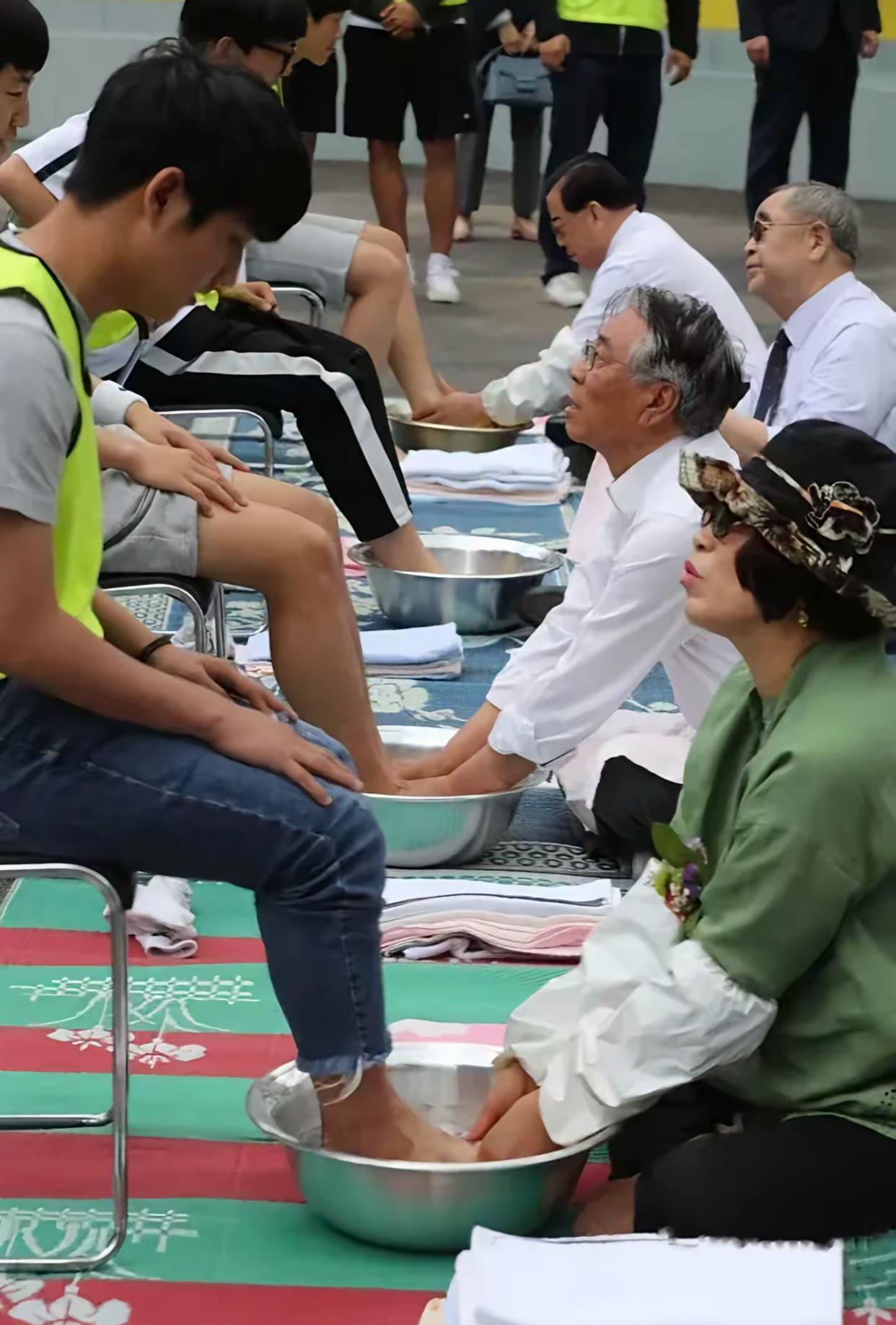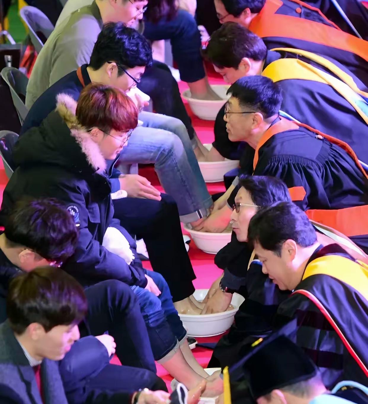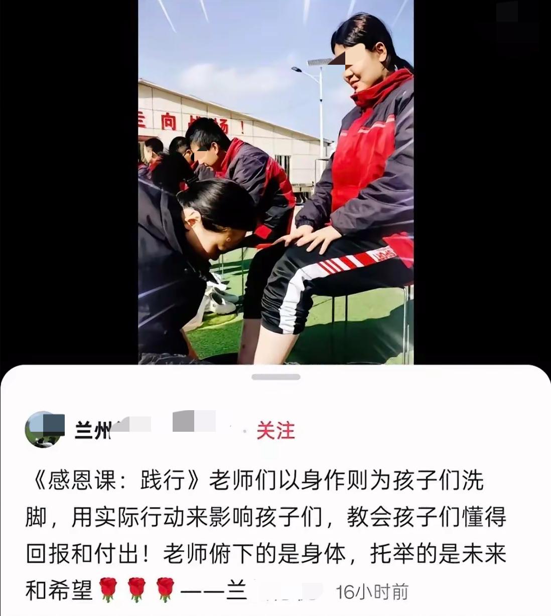 学韩国什么不好,让老师给学生洗脚…… 一开始以为兰州这所学校让老师蹲在洗脚盆前是校长灵光一现,查了一下资料才知道“洗足仪式”这个词,韩国很多学校都有让校长、老师端着洗脚盆为学生服务的传统,目的是增进感情。这个行为放在自古以来讲究尊师重教的中国实在难以接受,如果我是学生家长,绝不会允许让老师给孩子洗脚,这就是在曲解感恩这个词。