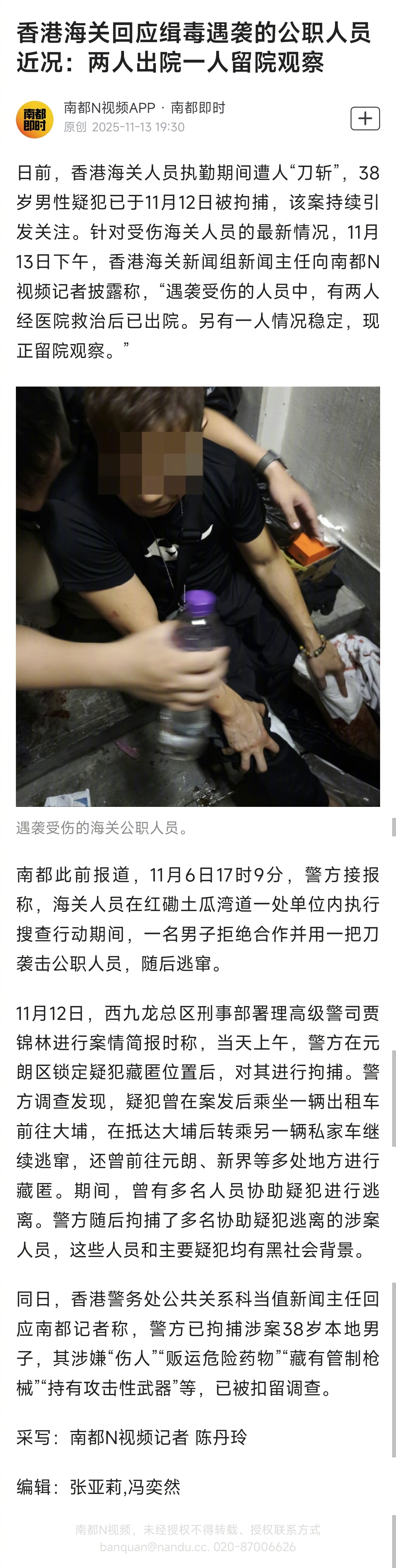 【:两人出院一人留院观察】日前,香港海关人员执勤期间遭人“刀斩”,38岁男性疑犯已于11月12日被拘捕,该案持续引发关注。针对受伤海关人员的最新情况,11月13日下午,香港海关新闻组新闻主任向南都N视频记者披露称,“遇袭受伤的人员中,有两人经医院救治后已出院。另有一人情况稳定,现正留院观察。”南都此前报道,11月6日17时9分,警方接报称,海关人员在红磡土瓜湾道一处单位内执行搜查行动期间,一名男子拒绝合作并用一把刀袭击公职人员,随后逃窜。11月12日,西九龙总区刑事部署理高级警司贾锦林进行案情简报时称,当天上午,警方在元朗区锁定疑犯藏匿位置后,对其进行拘捕。警方调查发现,疑犯曾在案发后乘坐一辆出租车前往大埔,在抵达大埔后转乘另一辆私家车继续逃窜,还曾前往元朗、新界等多处地方进行藏匿。期间,曾有多名人员协助疑犯进行逃离。警方随后拘捕了多名协助疑犯逃离的涉案人员,这些人员和主要疑犯均有黑社会背景。