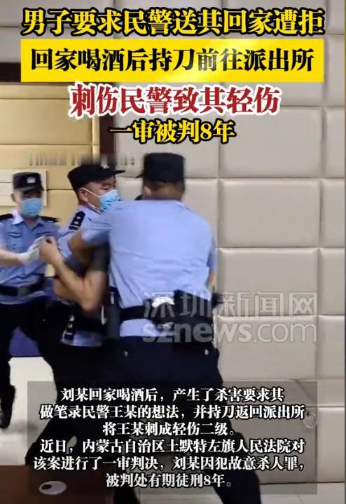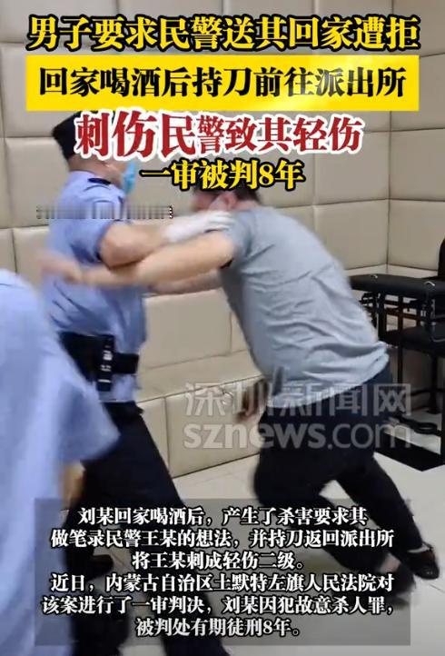 内蒙古,一男子酒后持刀进入派出所,将一位民警刺伤。后经调查,原因是办案民警拒绝开车将男子送回家后,遭到男子的辱骂。另一位民警对男子做了笔录,谁知男子回到家后气不过,喝了点酒壮着胆子持刀进入派出所报复了该民警,致轻伤二级。这下男子悲剧了,他的行为被法院认定为故意杀人罪。(来源:深圳新闻网) 今年4月份,男子刘某的妻子与他人发生了点矛盾,随后报警处理。刘某作为家属代表,到派出所接受了调查。 在调查结束后,刘某要求负责办案的民警开警车送他回家。对于这个要求,民警果断拒绝了,谁知刘某突然指着民警就是一顿辱骂。 当时值班民警王警官立即控制住刘某,并要求刘某配合做询问笔录。可刘某一开始并不肯配合,还与王某发生了激烈的言语冲突。 在做完笔录后,已经晚上9点了,刘某独自回到家中,但心中那股恶气始终消不掉,他一个人闷头喝了一碗白酒。酒精上头导致他越想越气,竟产生了报复王某的疯狂念头。 当晚12点20分左右,刘某从家中拿了三把刀,一把长水果刀别在身后的裤腰带上,两把短刀塞进裤兜,然后骑着电动自行车直奔派出所。 到了派出所门口,他观察了一下,发现王某正坐在电脑旁的椅子上办公,于是推开值班室的门,然后走到距离王某半米左右的地方,掏出长水果刀向着王某的左侧背部刺了过去。 王某被刺中后第一时间向前扑倒在地上,但刘某立即追了上来,准备继续持刀捅刺。其他值班民辅警见状及时上前,救下了王某。经鉴定,王某的伤情达到了轻伤二级。 由于刘某公然在派出所行凶,此事闹得非常大,但不少网友表示,既然是民警传唤刘某到派出所调查,那为何调查结束后不送回去,这不合理啊,刘某又不是违法行为人。 但也有网友表示,法律上好像并未规定在调查结束后,警车必须送当事人回家吧? 那此事到底该作何评价? 从法律上来讲,警车的使用是有明确规定的,非执行公务时不得擅自使用警车。 《警车管理规定》第2条规定,警车,是指公安机关、国家安全机关、监狱管理机关、人民法院、人民检察院用于执行紧急职务的机动车辆。 比如:公安民警执行侦查、警卫、治安、交通管理的巡逻、勘察、护卫等。 《人民警察法》第21条规定,人民警察遇到公民、人身、财产安全受到侵犯或者处于其他危难情形,应当立即救助;对公民提出解决纠纷的要求,应当给予帮助;对公民的报警案件,应当及时查处。 具体到本案,刘某的妻子与人发生争执后,警方介入处理,刘某作为家属代表到派出所接受调查,这都属于合理的办案程序,民警也有义务处理。 可是法律上并没有明确规定民警有义务送刘某回家,而且当时刘某意识清楚,身体也没有什么不舒服,并不属于处于危难之中的情形。 因此,民警拒绝刘某送其回家的要求并没有违法。 至于有些地方的民警在调查完后送当事人回家,这只是个别情形,属于人性化的服务,而不是民警的义务。 更何况,民警不送刘某回家,难道就是刘某辱骂民警的理由吗? 在调查结束后,就因为民警拒绝送刘某回家,刘某就在派出所辱骂民警。如果严格一点,刘某的行为已经违反了《治安管理处罚法》,民警是可以对刘某实施行政拘留措施的。 但是值班民警王某介入后,只是对刘某做了笔录,并没有选择拘留刘某,这已经是网开一面了。 可刘某却因此对王某产生了报复之心,这显然没有道理。拒绝送刘某回家的也不是王某,可刘某却持刀进入派出所对王某实施刺杀行为,甚至导致王某轻伤二级,这个行为显然构成了犯罪。 那为何刘某的行为是故意杀人罪,而不是故意伤害罪,或袭警罪? 袭警罪一般的刑期是3年以下有期徒刑、拘役或者管制.如果使用枪支、管制刀具或者以驾驶机动车撞击等手段,严重危及其人身安全的,处3年以上7年以下有期徒刑。 由此可见,刘某的行为是构成袭警罪的。 同时根据刘某的询问笔录的内容来看,他自述是为了报复王某。而从王某的伤情来看,仅仅是左侧背部被捅了一刀,就达到了轻伤二级的程度。 这说明刘某这一刀的危害极大,如果不是王某及时躲闪,很有可能会命丧当场。 由此可见,刘某所刺中的地方已经威胁到了王某的生命,这也足以说明刘某是奔着剥夺王某生命而实施的犯罪行为。 因此,刘某的行为也符合故意杀人罪的构成条件。 由于刘某袭警的同时想要杀害王某,所以同一行为出现了罪名的竞合,故应当以重罪故意杀人罪处理。 不过,由于王某并未死亡,所以刘某的行为属于犯罪未遂,再加上刘某到案后认罪认罚,故可以从宽处罚。 最终,法院判决刘某构成故意杀人罪,处8年有期徒刑。