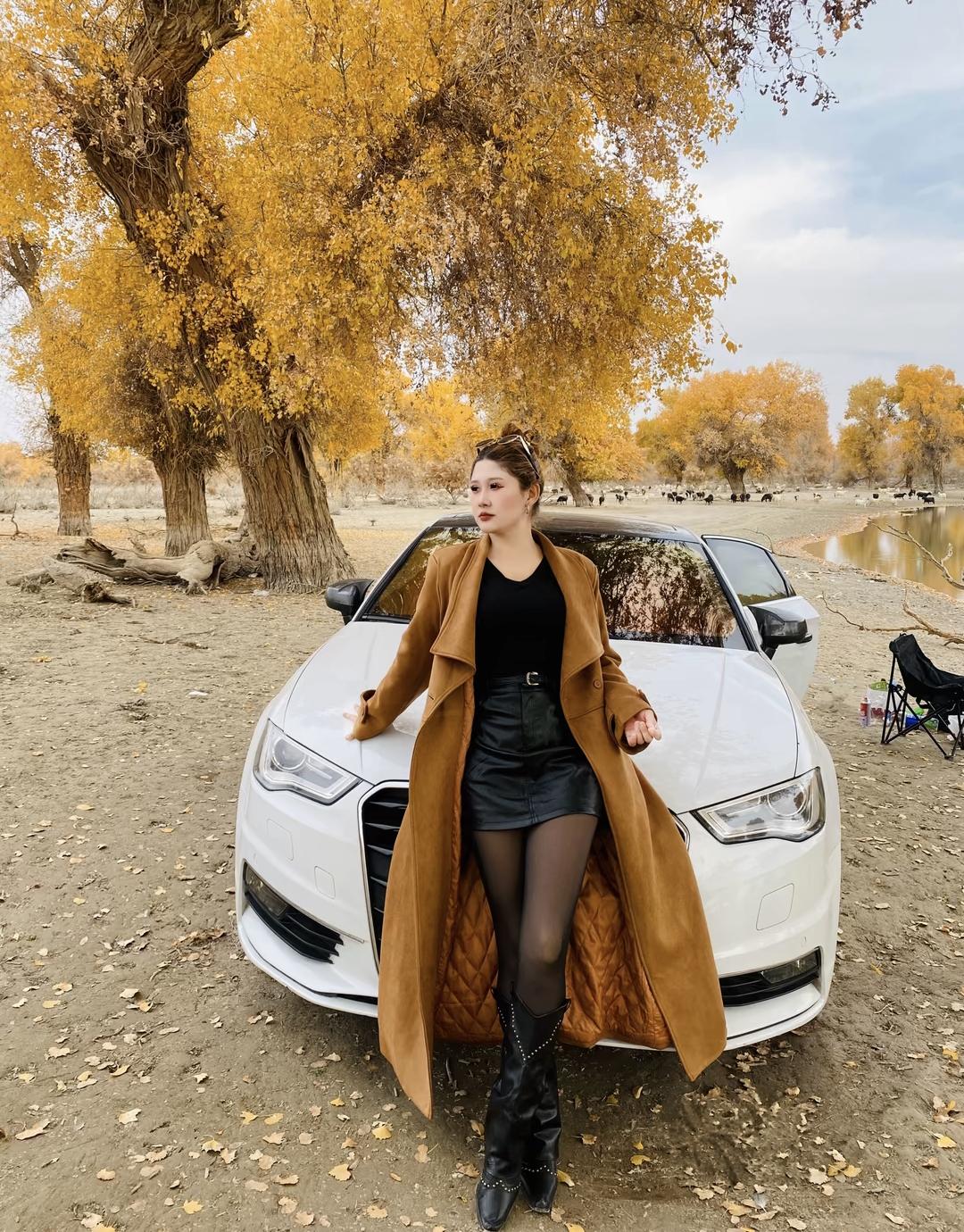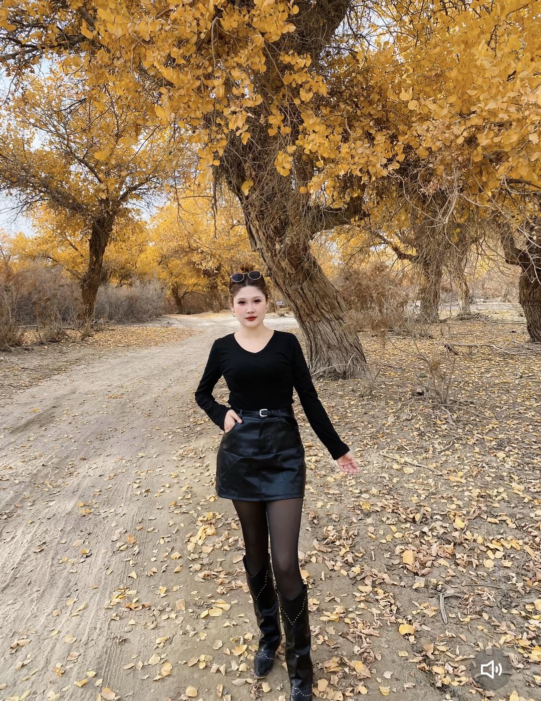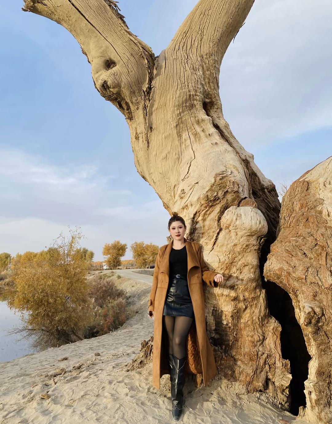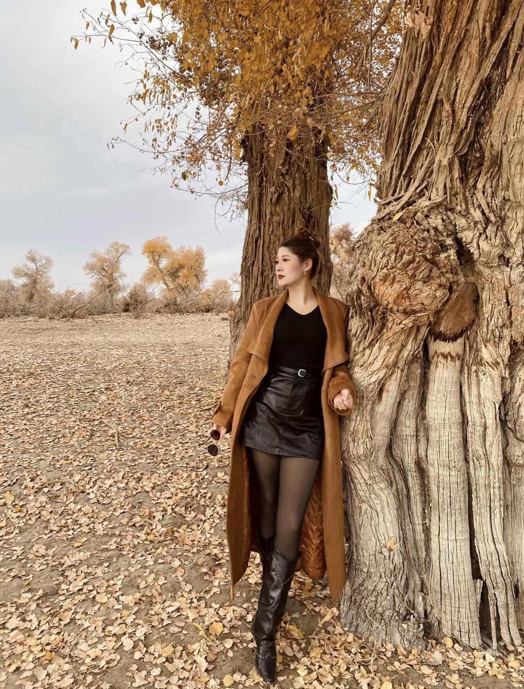 秋日漫步,树旁轻倚,时尚穿搭,自然之美。
