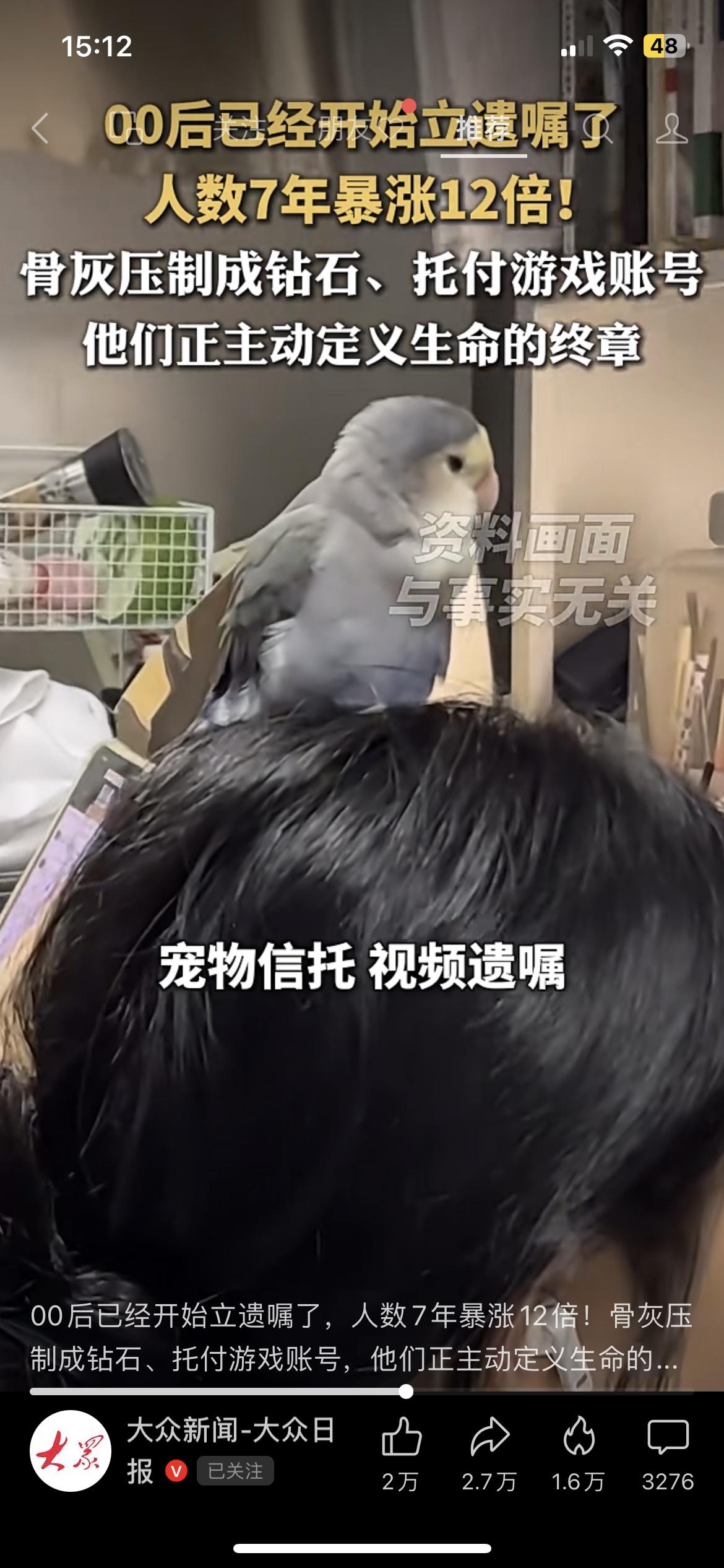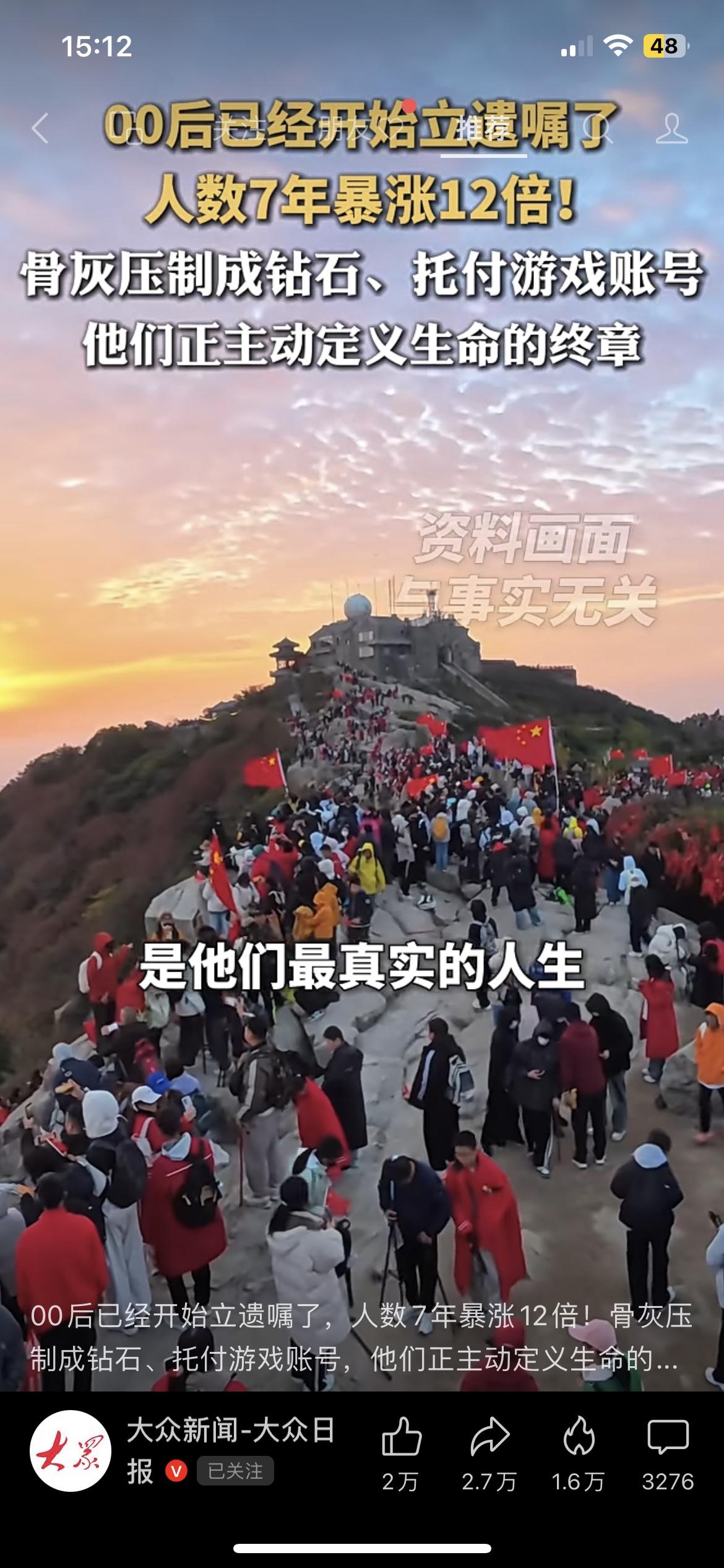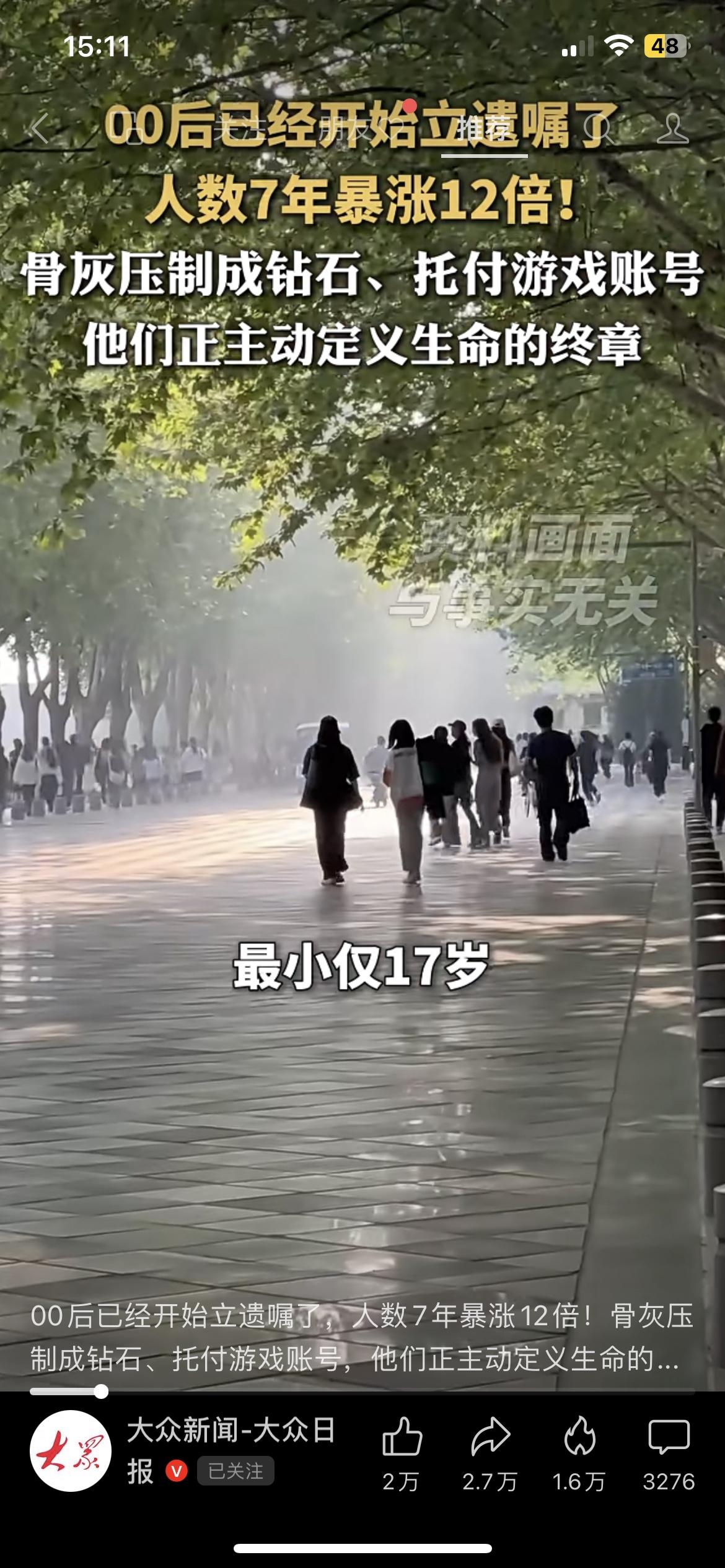 00后立遗嘱!7年涨了12倍? 真没想到!现在00后立遗嘱的人,7年居然涨了12倍!不光写房产钱,还把游戏账号、宠物写进去,甚至要把骨灰做成钻石随身带…这届年轻人连“身后事”都整得这么潮,我这老阿姨都看懵了! 换你20出头会立遗嘱不?这是通透还是想太多了? 转给你身边的00后,问问他们是不是真有人这么干!