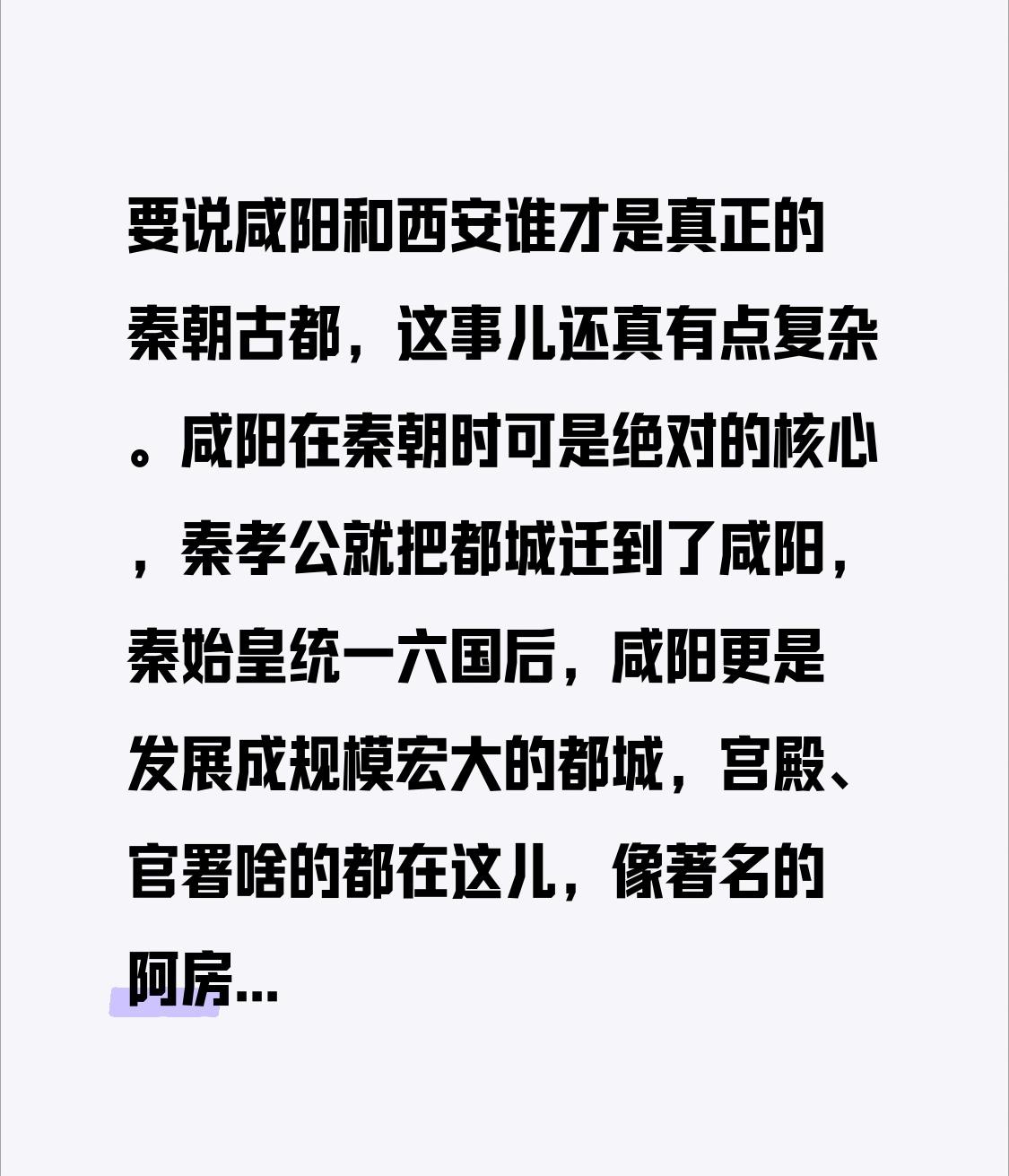 要说咸阳和西安谁才是真正的秦朝古都,这事儿还真有点复杂。咸阳在秦朝时可是绝对的核心,秦孝公就把都城迁到了咸阳,秦始皇统一六国后,咸阳更是发展成规模宏大的都城,宫殿、官署啥的都在这儿,像著名的阿房宫就部分在咸阳。 不过呢,西安也和秦朝脱不了干系。西安如今的部分区域在秦朝时也属于京畿之地,有不少秦朝的遗迹。而且从历史发展和地域变迁来看,现在咸阳和西安地域相邻,联系紧密。所以啊,非要争个谁是真正的古都有点难,不如说它们都是秦朝历史文化重要的承载地。