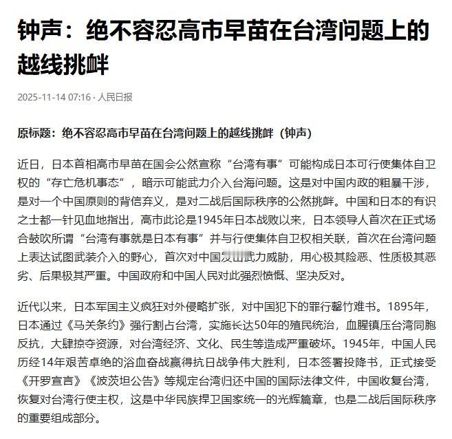 高市早苗的言论极其出格和错误,也是碰触了中日关系的政治基础,性质特别恶劣,后果特别严重。更让人气愤的是,在中国通过多种途径表达不满后,高市早苗还是不收回言论,而且日本政府一些部门和人员还替她背书,粗暴干涉中国内政,严重侵害了中国的利益,必须进行反制。 中国政府全方位的外交和其他努力,既向日本传递明确的信息,也是表达强烈的愤怒。从外交部领导召见日本大使,到外交部发言人连发四问,到人民日报公开发声,到各界力量表达不满,可以说中国的抗议是全方位的。如果日本再听不懂人话,再不改正错误,后面中国的反制就不仅仅在外交和口头上这么简单,而是会有实实在在的行动!