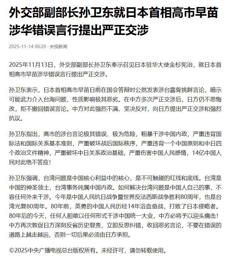 高市早苗的言论极其出格和错误,也是碰触了中日关系的政治基础,性质特别恶劣,后果特