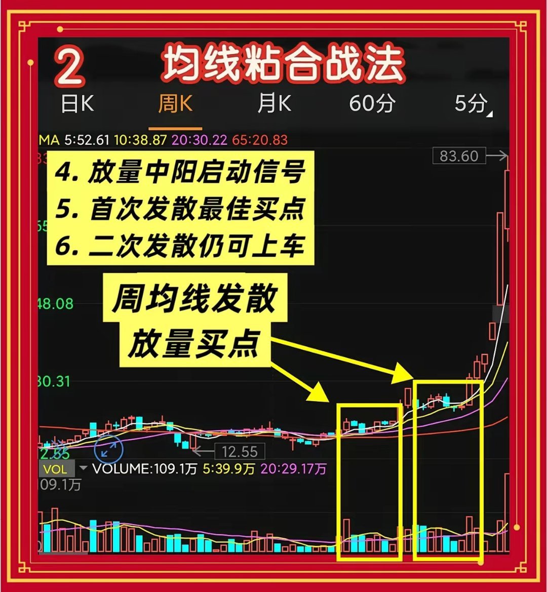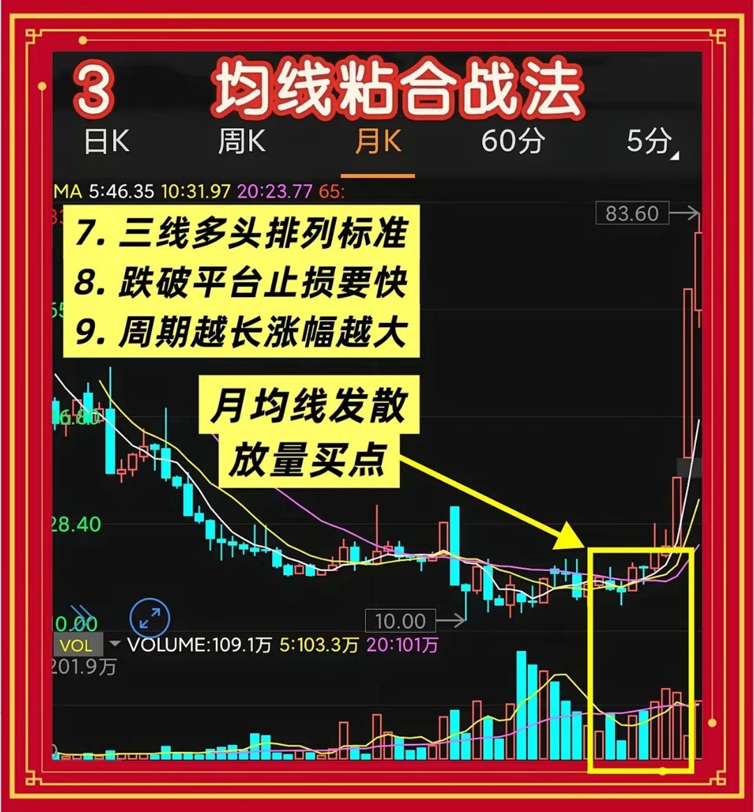 均线粘合战法:波段行情起爆点的九条铁律一、定义篇 1. 均线粘合指三条以上短、中、长期均线间距极小,甚至重合,反映股价长期横盘震荡。 2. 本质是筹码高度集中,主力低位吸筹,变盘信号强烈。 3. 粘合时间越长,后市发散空间越大;周线级别粘合往往孕育年度级别行情。二、位置篇 4. 低位粘合:长期均线上行,中短期回调后粘合,获强支撑,波段走强概率高。 5. 高位粘合:长期均线下行,中短期反弹后粘合,若无量突破长期线,易受压回落。三、形态篇 6. 标准形态:自上向下依次是5、10、20、30、60日线,短期在上,长期在下,喷射状发散。 7. 非标准形态:以60日线为轴,短期线或交叉,但方向同步向上,仍属有效。四、量能篇 8. 粘合末期成交量须逐步萎缩,启动日需放量中阳或大阳,量能越大,可靠性越高。 9. 突破时若出现一到两根跳空高开巨阳线,视为加速信号,可加仓跟进。五、买点篇 10. 首次发散:股价放量突破粘合区,短期均线上扬30度以上,为最佳首仓点。 11. 再次发散:此前曾发散又粘合,第二次向上发散力度最强,第三次后力度递减,谨慎追高。 12. 均线拐点右侧交易:20日线走平后向上,股价回踩不破,收阳即可低吸。六、卖点篇 13. 低位发散后涨幅超30%放弃追高,高位出现粘合向下发散,无论盈亏先减仓。 14. 高位巨量长阴跌破粘合区,或5日线下穿10日线且MACD红柱缩短,视为逃命信号。七、周期篇 15. 短中期粘合仅适做反弹,中长期粘合才有主升浪;周线、月线粘合决定牛市起点。 16. 粘合发散成功率与周期正相关,周期越长,后续涨幅越大,持股时间可相应延长。八、风控篇 17. 买入前设好止损位,有效跌破粘合平台下沿3%即离场,防止假突破。 18. 单只个股仓位不超总资金20%,分散布局两到三条不同行业粘合标的,降低系统性风险。九、实战流程 19. 先用选股公式筛出近20日均线粘合个股,再人工剔除高位、高估值、利空行业。 20. 加入自选后跟踪三日,确认放量、中阳、均线多头发散同时出现,于尾盘或次日早盘介入。 21. 持仓期间以20日线做动态止盈,线上持股,线下减仓,直至出现明显顶部信号。均线粘合之下无秘密,筹码集中之后是主力的号角。