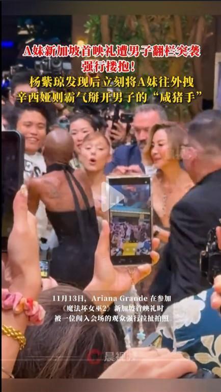 女星走红毯也是一件危险的事,如果离观众较远不利于互动和亲民,离观众近了又要防止有人越轨合影。在新加坡举行的《魔法坏女巫2》首映礼红毯上,因为离观众近就出现了意外,一个男子伸手搂抱美国顶流歌手A妹合影。多亏A妹身边的几位明显反应快,直接把A妹拉开并拉开了男子的手,男子随即被保安也拉开了。当明显也不容易,既要有追求的粉丝,也怕有狂热的粉丝,还要小心有别有用心者。有时对粉丝厉害了,也会失去很多人的支持。