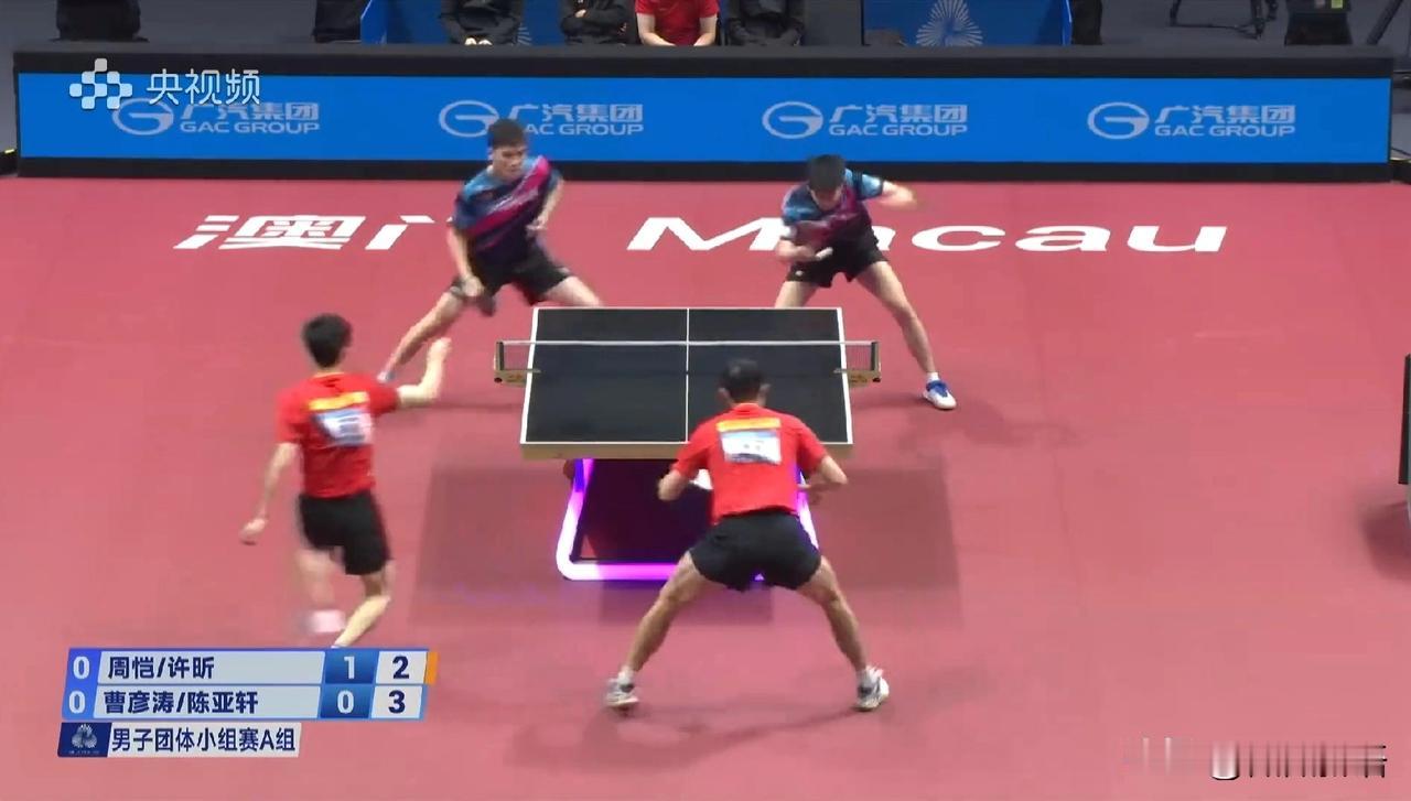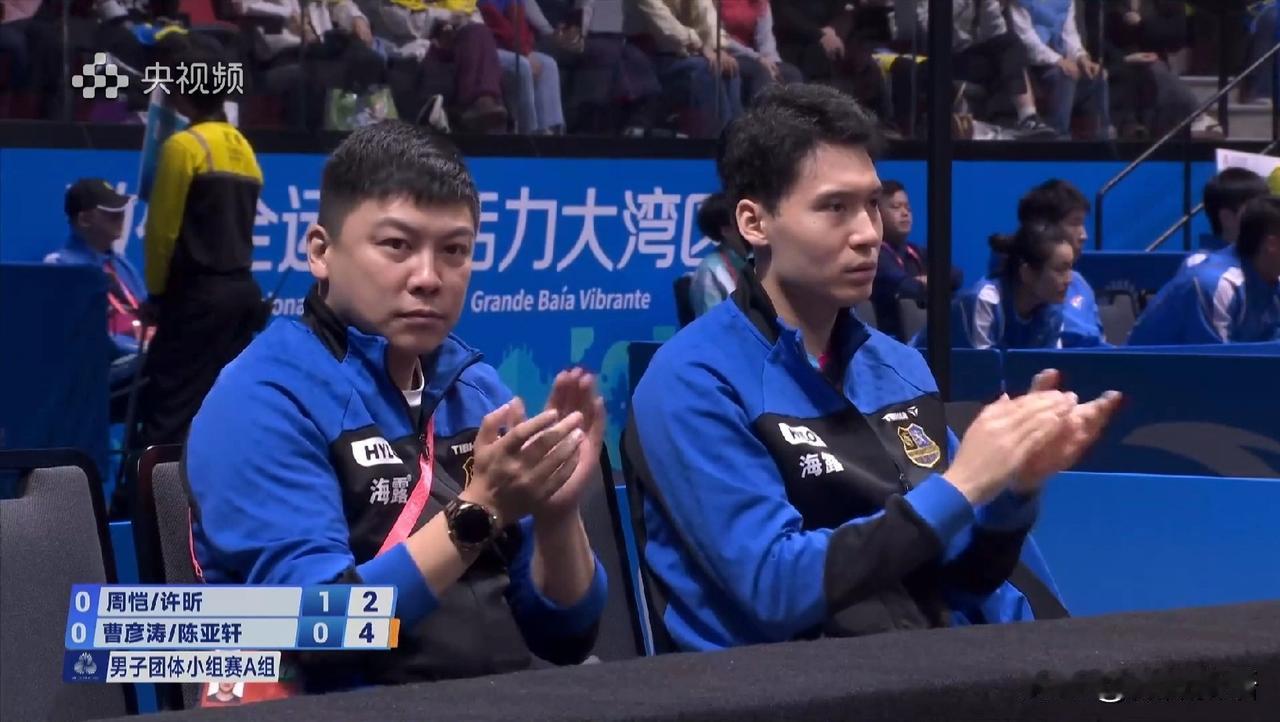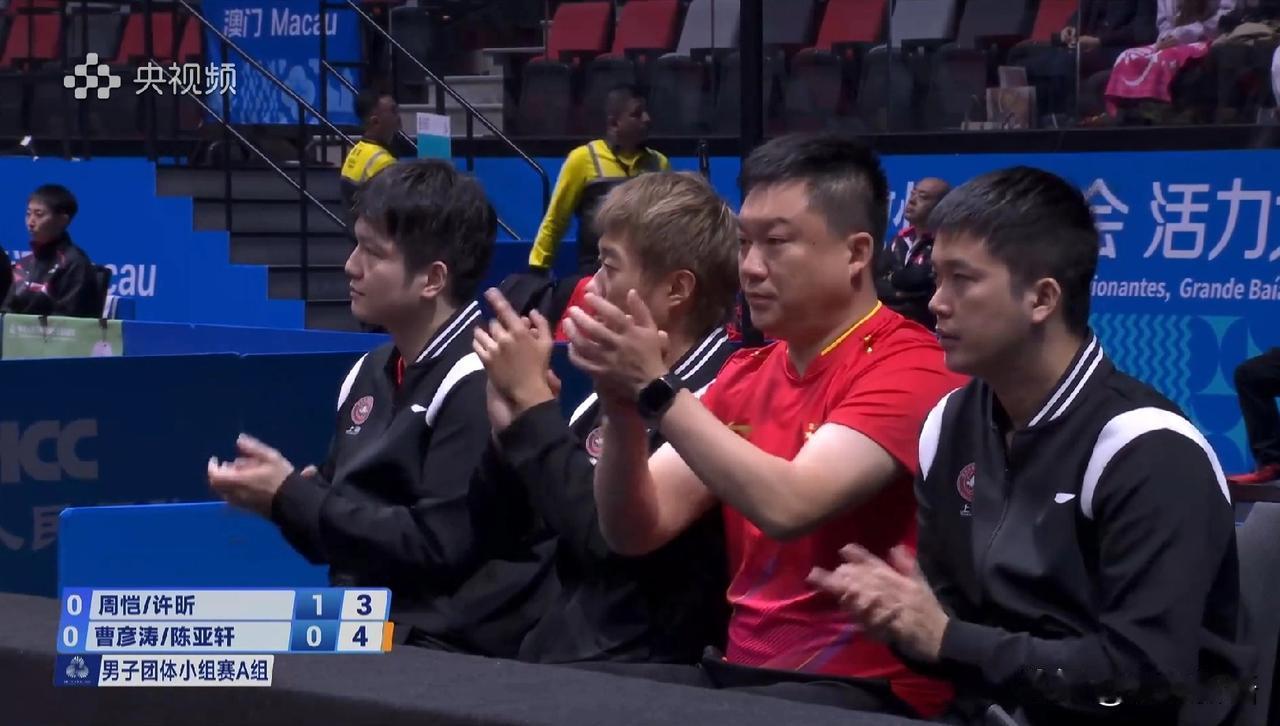 许昕和周恺第一盘的男双赢了。 今天是全运会乒乓球团体赛成人组的首个比赛日,上海男团和江苏男团的比赛在一号台,央视频有在转播一号台至五号台的比赛。现在比赛已经开始了,第一盘男双的比赛周恺/许昕对阵曹彦涛/陈亚轩,一上来上海队是先赢一局。 看到江苏队的教练是陈玘,第二局比赛江苏队一开始小比分领先,周恺/许昕把比分反超到6:5时,陈玘叫了暂停,暂停的时候听到陈玘和队员说打的不要那么着急嘛,一顿输出后,比赛继续,重新回到赛场上,两对组合比分也是咬的很紧,不过在关键分的处理上,还是许昕他们更有经验,许昕/周恺是11-9再赢一局,大比分2-0领先。 这次全运会许昕只参加团体赛,他也是提前三四天到的澳门,来了的这几天一直在认真备战,今天赛前也是跟周恺一起练球了。到了第三局比赛,江苏队是扳回一局,局间陈玘和他们俩说,他俩不好打,你们俩要发挥好。到了第四局,许昕周恺11-8赢下,大比分3-1拿下第一盘,为上海队拿下第一分。 第二盘比赛是樊振东对阵孙闻,加油!还是团体赛更好看一些,大家真的是劲儿往一处使了。