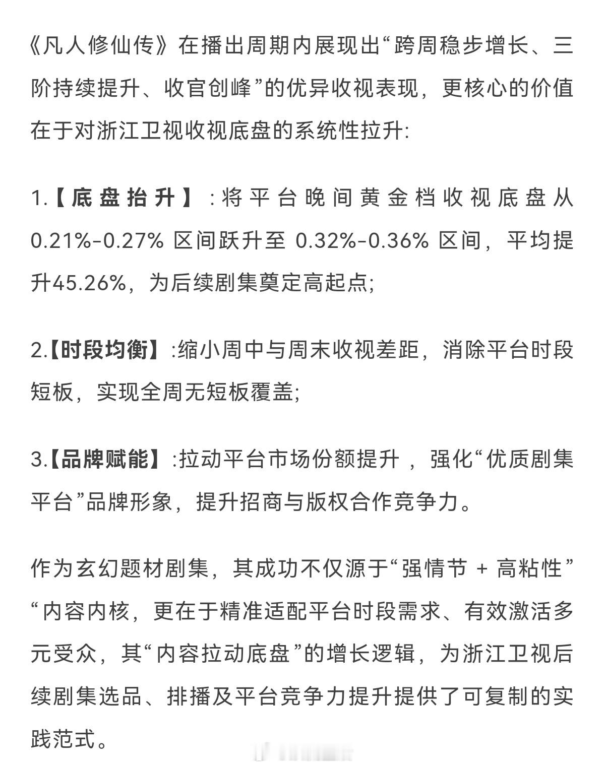 凡人修仙传上星浙江卫视不仅是拿下了年冠的好成绩,还直接给带来看得见摸得着的经济效益。不仅是播出期间的优异收视表现,还对浙江卫视收视底盘的有系统性拉升。杨洋IP的影响力不断显现,第二季能搞起来了吗?