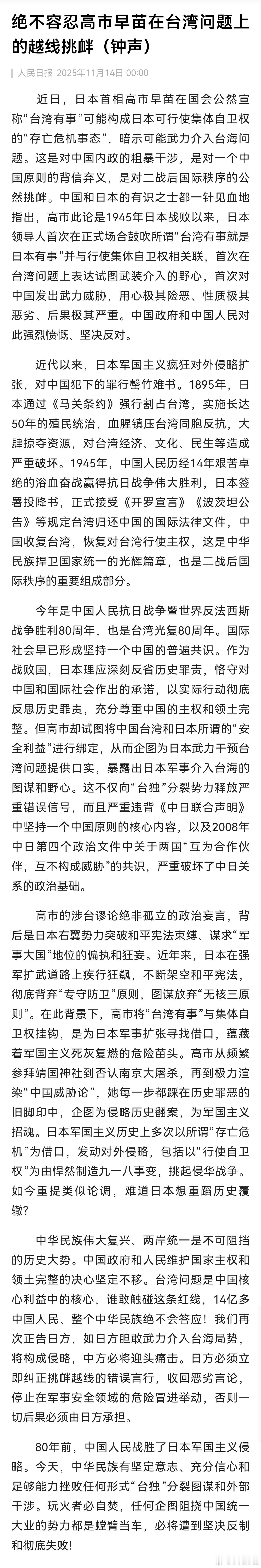 高市毒苗的几个首次!人民日报:日本领导人首次在正式场合鼓吹所谓“台湾有事就是日本有事”并与行使集体自卫权相关联,首次在台湾问题上表达试图武装介入的野心,首次对中国发出武力威胁,用心极其险恶、性质极其恶劣、后果极其严重。