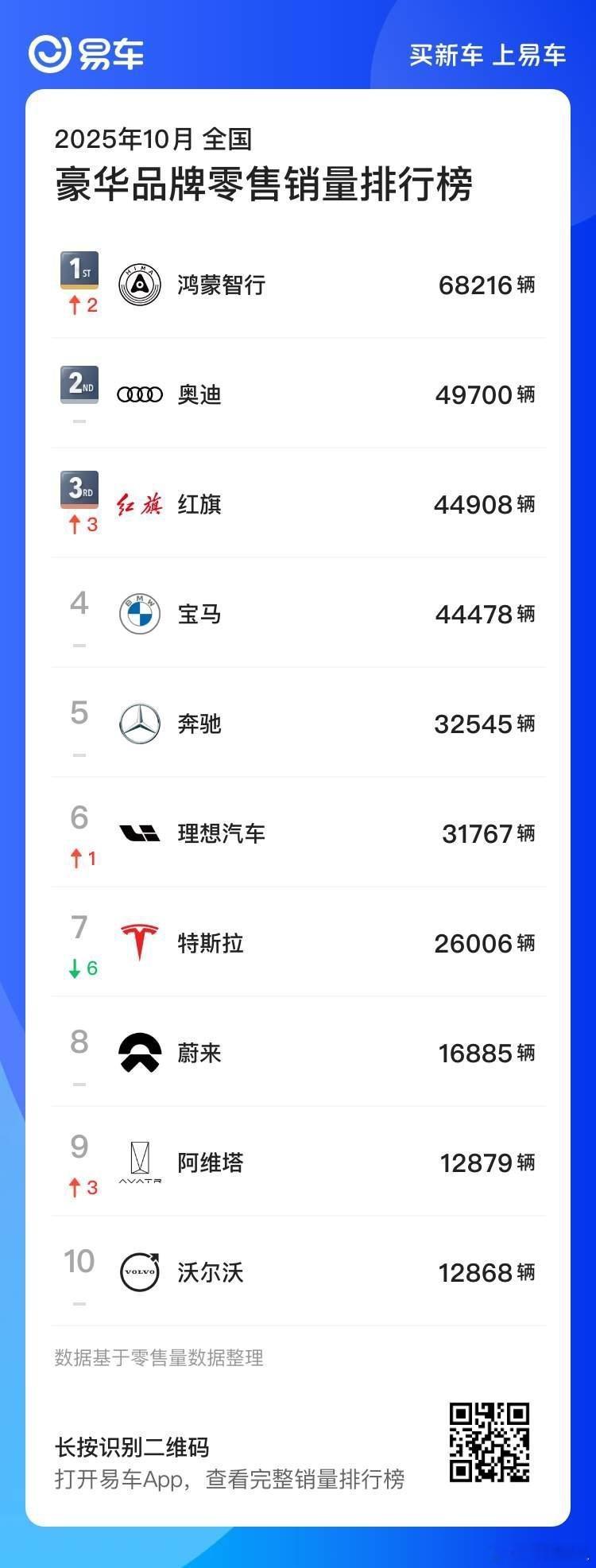 10月国内豪华品牌汽车销量,鸿蒙智行第一,超过奥迪、宝马、奔驰。