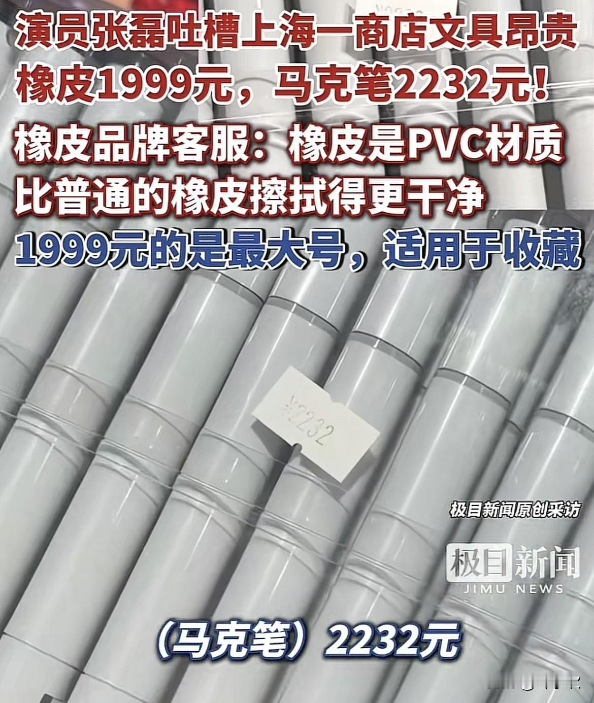 不仅平民百姓, 就连知名演员张磊, 看到上海这家文具店的物价,都要摸摸钱包。 近日,演员张磊发布视频吐槽上海一家文具店价格高的吓人,可以看到一支马克笔2232元,但外观看起来也非常普通,一款橡皮擦1999元。 虽然对于上海的物价水平早有耳闻,但是让很多网友都想不到,这文具价格竟然也高得那么离谱。 后续,工作人员也证实了确实是这个价格,不过2232元的马克笔实则是一个套装,里面包含72支不同颜色的马克笔,而那块橡皮擦是属于大品牌的最大号收藏款。 尽管工作人员解释了,但包括我在内的很多网友也不理解为什么这么贵。 对此,你怎么看?