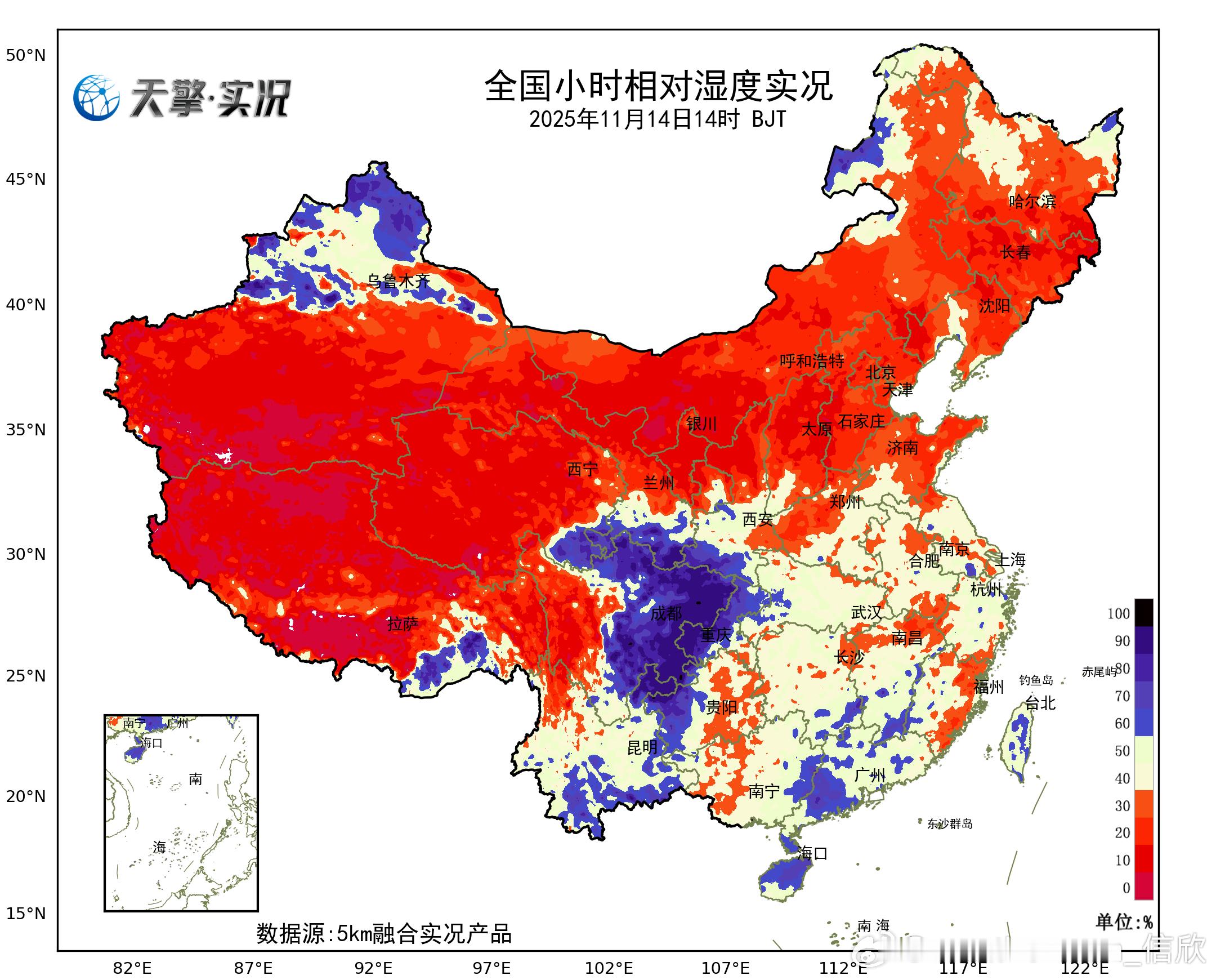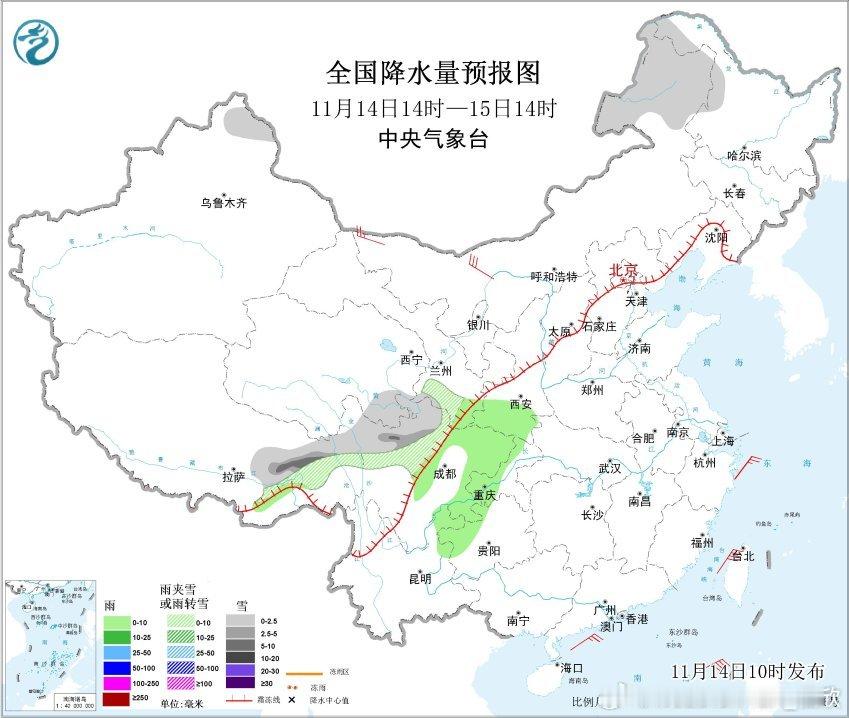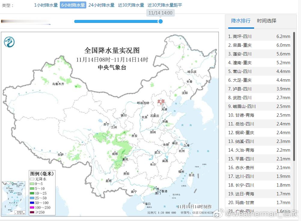 【降水和干燥】今天08-14时,我国降水稀少,主要在四川重庆有些小雨,新疆北部的降雪收敛。今天下午高原地区以及北方大部,空气干燥,银川相对湿度只有14%。因为总体上水汽条件差,今天下午到明天中午,我国的降水也不多。内蒙古东北部、西藏东北部、四川西北部可能有降雪,四川东部、重庆等地有小雨。