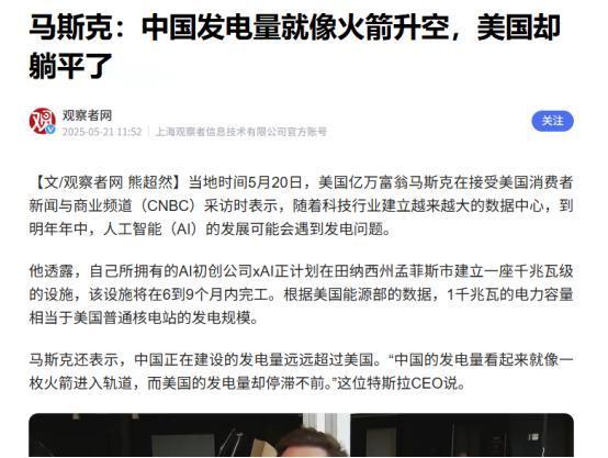 马斯克当着美国五星上将的面,直接把桌子掀了。他说,到年底,中国的发电量,是美国的2.5倍。整个五角大楼,沉默了......     最近五角大楼开了个会,主题是“国家能源安全与科技战略”,来的都是些军方大佬和行业专家,连五星上将都坐在主位上,本来气氛挺严肃的,大家你一言我一语,不是说怎么守住美国在页岩油上的优势,就是讨论怎么卡别人新能源的脖子,满屋子都透着股“咱们还是老大”的劲儿。   结果马斯克一开口,直接把这股劲儿给戳破了,场面一下子就冷了下来。马斯克本来是作为科技界的代表来的,毕竟他手里有特斯拉,还有SpaceX,在能源和科技领域说话分量不轻。   一开始他还没怎么插话,就坐在那儿听,直到有个军方官员提到“美国要保持能源科技领先,防止其他国家赶超”,他突然开口了,声音不大,但整个会议室都能听见:“别防了,就说发电量吧,到年底,中国的发电量得是美国的2.5倍。”   这话一出口,刚才还嗡嗡响的会议室瞬间就静了,连掉根笔都能听见。坐在主位的五星上将手里的笔都顿了一下,原本皱着的眉头拧得更紧,脸色从之前的严肃直接沉了下来,跟蒙了层灰似的。旁边几个参谋官本来还在低头记笔记,听见这话,手都停了,抬头看马斯克,又赶紧转头看上将,眼神里全是“这话咋接”的尴尬。   没人吭声,整个五角大楼的这间会议室,就这么沉默着,空气都像凝固了一样,连空调的声音都显得特别突兀。 其实谁都知道,马斯克不是随口瞎说的,他手里有数据。   就说去年吧,中国的发电量已经到了8.9万亿千瓦时,美国呢?才4.2万亿,这就已经是2倍多了。   今年中国这边,不管是水电、风电还是光伏,都还在往上冲,尤其是新能源发电,一季度就比去年多了12%,反观美国,传统火电因为能源价格波动,开工率一直上不去,新能源又因为供应链问题,装机速度慢得很,照这趋势,年底中国发电量是美国的2.5倍,根本不是夸张,就是实打实的事儿。   但军方的人不想听这个,更不想当着这么多人的面被点破。他们讨论“能源安全”,其实心里想的是“美国得一直占着优势”,可马斯克一句话就把这层窗户纸捅破了——优势早不在了,甚至已经被反超了。   而且最让他们难受的是,发电量背后藏着的东西,比数字本身更扎心。 你想啊,发电量不是凭空涨的,得有产业撑着。中国为啥发电量这么高?因为制造业规模在那儿摆着,全球一半以上的家电、三分之一的汽车都是中国造,这些工厂一天24小时不停转,能不耗电吗?   还有新能源产业,中国的光伏组件产量占全球80%,电动汽车销量占全球一半还多,这些产业本身就是高耗电的主儿,但同时也是高附加值的产业,能带动一堆上下游企业,这说明中国的产业实力不是虚的,是真能靠电力撑起来的实实在在的规模。   反观美国,这些年制造业一直在往外迁,工厂少了,发电量自然上不去,就算想补,供应链都断了,想建个电池厂,连原材料都得从中国进口,这差距可不是一星半点。   更关键的是科技动能。现在的高科技产业,哪个离得开电?数据中心、人工智能、半导体制造,全是“电老虎”。   中国现在建了多少数据中心?光超大型数据中心就有200多个,占全球三分之一,这些数据中心是干啥的?是支撑云计算、人工智能的,像阿里、腾讯的AI大模型,还有各种互联网服务,都得靠这些数据中心跑起来。   半导体方面,中国的芯片制造工厂虽然还在追赶,但产能一直在扩,而制造芯片的光刻机,一天24小时不能停,耗电量大得吓人。这些都说明,中国的科技产业不是嘴上说说,是真的在靠电力堆出实实在在的进展。   美国呢?数据中心也多,但很多都是给国外企业服务的,本土的科技制造业没跟上,光有数据中心,没有配套的产业,发电量自然上不去,科技动能也就弱了一截。   最让五角大楼揪心的,其实是战略安全。能源安全从来都是国家安全的重中之重,尤其是电力,不管是军工生产、国防设施,还是老百姓的日常生活,都离不了电。   中国的发电量高,而且能源结构越来越稳——水电靠长江黄河,风电光伏靠西北和沿海,煤炭储备也够,就算国际能源价格怎么涨,中国的电力供应都能稳住,这叫能源自给率高,不怕别人卡脖子。   可美国呢?一直依赖石油进口,虽然有页岩油,但石油价格一波动,整个能源体系都跟着晃,去年冬天因为天然气价格暴涨,不少州都限电了,连军工工厂都差点停摆。   会议室里沉默了好一会儿,才有个官员小声说“数据可能有误差”,但这话刚说出口,就被马斯克怼回去了:“误差?我这儿有中国国家能源局的月度报告,还有美国能源信息署的数据,你要的话我现在就能发你邮箱。”   这话一说完,更没人吭声了。那个五星上将脸色更沉了,最后只说了句“会议暂停15分钟”,就起身走了,走的时候脚步都比平时重了不少。 其实谁都明白,这15分钟的暂停,不是休息,是让大家消化这个现实。