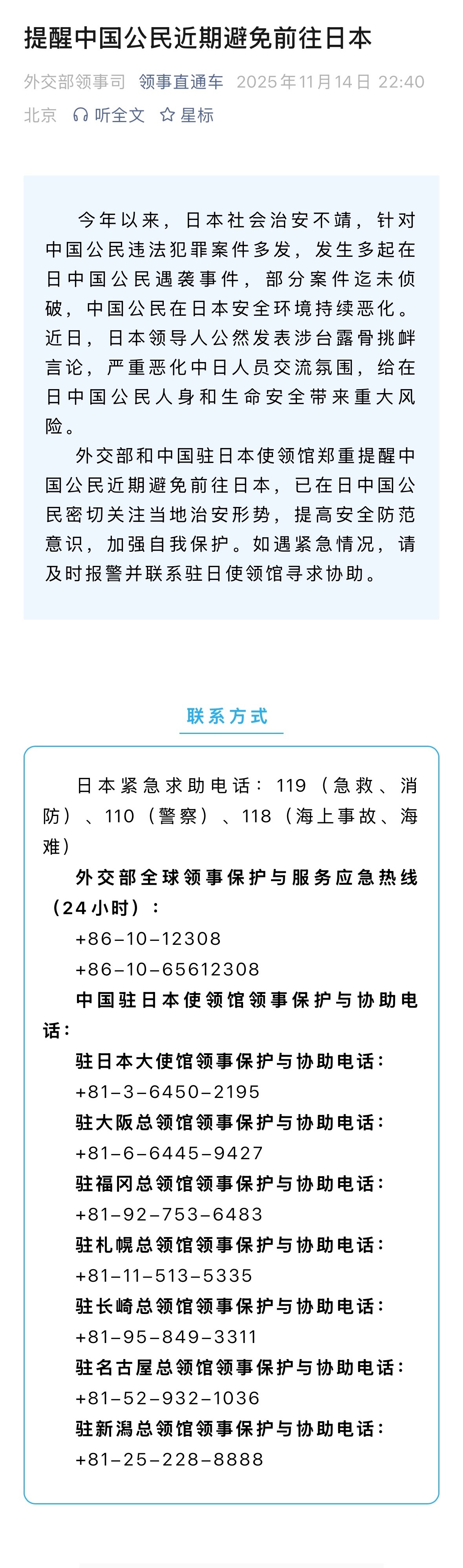 【外交部:】今年以来,日本社会治安不靖,针对中国公民违法犯罪案件多发,发生多起在日中国公民遇袭事件,部分案件迄未侦破,中国公民在日本安全环境持续恶化。近日,日本领导人公然发表涉台露骨挑衅言论,严重恶化中日人员交流氛围,给在日中国公民人身和生命安全带来重大风险。外交部和中国驻日本使领馆郑重提醒中国公民近期避免前往日本,已在日中国公民密切关注当地治安形势,提高安全防范意识,加强自我保护。如遇紧急情况,请及时报警并联系驻日使领馆寻求协助。 (领事直通车)