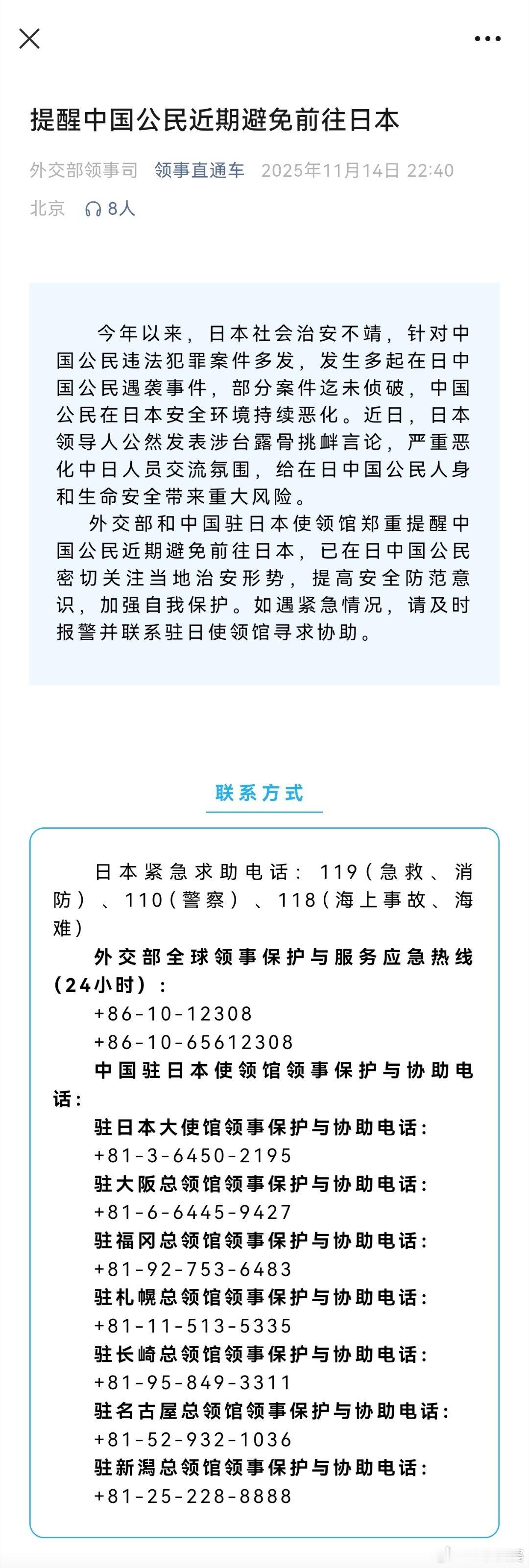【外交部领事司: 】今年以来,日本社会治安不靖,针对中国公民违法犯罪案件多发,发生多起在日中国公民遇袭事件,部分案件迄未侦破,中国公民在日本安全环境持续恶化。近日,日本领导人公然发表涉台露骨挑衅言论,严重恶化中日人员交流氛围,给在日中国公民人身和生命安全带来重大风险。外交部和中国驻日本使领馆郑重提醒中国公民近期避免前往日本,已在日中国公民密切关注当地治安形势,提高安全防范意识,加强自我保护。如遇紧急情况,请及时报警并联系驻日使领馆寻求协助。(来源:领事直通车)