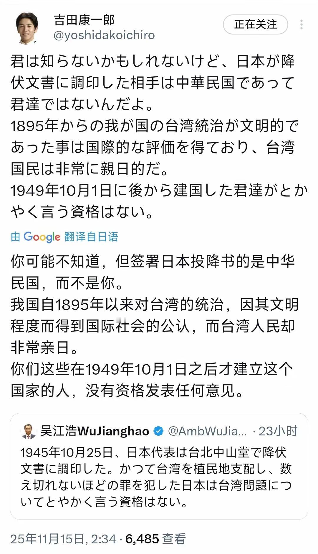 这个吉田康一郎把侵略殖民当成炫耀的资本,又无知又狂妄。他的行为直接否定了“村山谈话”的精神,1995年,村山富市,对当年日本对台湾的殖民统治和侵略行为进行了深刻反省和道歉,身为日本保守派人士和议员的吉田康一郎更该铭记历史、深刻反省,而不是用这种错误态度对待日本过去的侵略行为。与跳梁小丑无二!