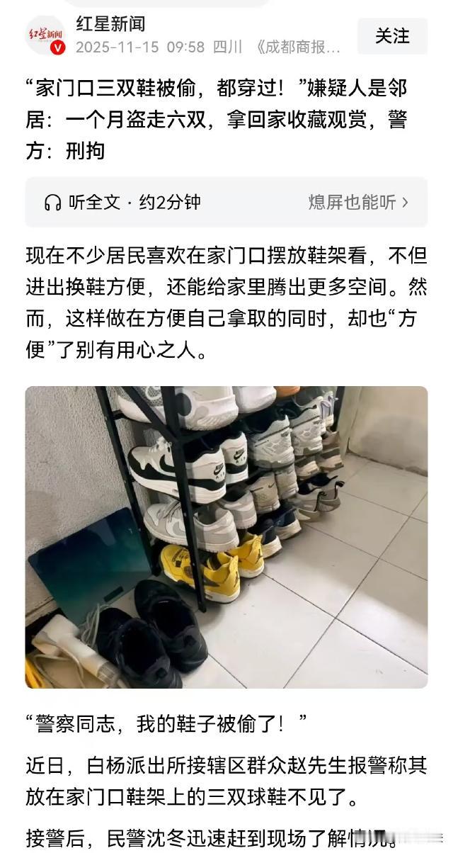 浙江杭州,赵先生出国三个多月,回来后发现自己放在门口的三双穿过的鞋丢了,赵先生报了警,民警走访发现丢旧鞋的不止赵先生一个,于是立即展开调查,调查结果让所有受害人意想不到。 据红星新闻报道,赵先生是钱塘某小区的业主,邻居们都喜欢将鞋架放在门口,赵先生也随大流买了一个鞋架,平时常穿的鞋都会放在门口鞋架上。 7月份,赵先生有事出了趟国,一直到前几天才回来。 倒完时差后,赵先生准备出门,谁知等他出去换鞋时发现,自己放在鞋架上的三双鞋不见了。这三双鞋是赵先生比较喜欢的,而且都穿过,不是新的。 赵先生很纳闷,如果是被保洁清理掉了,自己鞋架上放了这么多鞋,为什么只拿走这三双? 可如果是被人偷了,自己穿过的旧鞋,偷回去又有什么用? 赵先生担心会再丢,就报了警。 民警于是展开走访调查,结果发现丢鞋的竟然不止赵先生一个。 原来,除了赵先生,还有三个业主放在门口鞋架上的鞋也丢了。 为了搞清楚怎么回事,民警调取了周边的监控。 果然,他们从被盗业主门口的监控中发现了一名可疑男子。该男子经常穿梭在不同的楼道里,且鬼鬼祟祟的。 民警很快找到该男子,确认他是住在这里的租户陈某某,并在他的家里搜到球鞋6双。 陈某某交代,他很喜欢各式球鞋,但是这些鞋动辄几千上万,他经济拮据根本买不起。 上个月,他路过一名业主门口时,发现鞋架上的鞋虽然穿过,但是保养的挺好,便鬼使神差将鞋偷走了。 第一次得手后,陈某某见没人报警,胆子越来越大,于是在一个月内又陆续偷了5双带回家收藏。 案发后,陈某某因涉嫌盗窃罪被采取刑事强制措施。 为什么陈某某只是偷几双旧鞋,就被采取刑事强制措施?他偷鞋的行为到底是一般的盗窃行为,还是构成盗窃罪? 首先,我们要搞清楚,普通盗窃行为和盗窃罪并非同一概念。 普通盗窃行为通常指未达到盗窃罪入罪标准的盗窃行为,一般按照《治安管理处罚法》进行处理。 而盗窃罪则是一种犯罪行为,需依据《刑法》进行定罪量刑。 根据《刑法》第二百六十四条规定,盗窃公私财物,数额较大的,或者多次盗窃、入户盗窃、携带凶器盗窃、扒窃的,构成盗窃罪。 这表明,判断盗窃行为是否构成犯罪,关键在于是否满足数额较大或者多次盗窃等法定情形。 《最高法、最高检关于办理盗窃刑事案件适用法律若干问题的解释》第一条规定,盗窃公私财物价值一千元至三千元以上、三万元至十万元以上、三十万元至五十万元以上的,应当分别认定为刑法第二百六十四条规定的“数额较大”“数额巨大”“数额特别巨大”。 各地区可根据本地区经济发展状况,并考虑社会治安状况,在前款规定的数额幅度内,确定本地区执行的具体数额标准。 本案中,虽然陈某某盗窃的6双鞋子的价值不明,但根据一般球鞋的定价来看,6双鞋的价值大概率难以达到当地规定的数额较大标准。 所以,单从数额较大这一条件判断,难以认定陈某某构成盗窃罪。 但《最高法、最高检关于办理盗窃刑事案件适用法律若干问题的解释》第三条规定,二年内盗窃三次以上的,应当认定为多次盗窃。 陈某某在一个月内陆续偷了6双鞋,显然满足二年内盗窃三次以上的条件。 陈某某第一次偷鞋得手后,见无人报警便胆子越来越大,继续实施盗窃行为,这种行为具有明显的主观故意和连续性。 尽管被盗物品是旧鞋,但多次盗窃的行为本身反映出其行为的社会危害性和主观恶性达到了需要用刑法来规制的程度。 综上所述,即便陈某某盗窃的球鞋的价值达不到定罪标准,但他在一个月内多次盗窃的行为,符合多次盗窃的法律规定,构成盗窃罪。