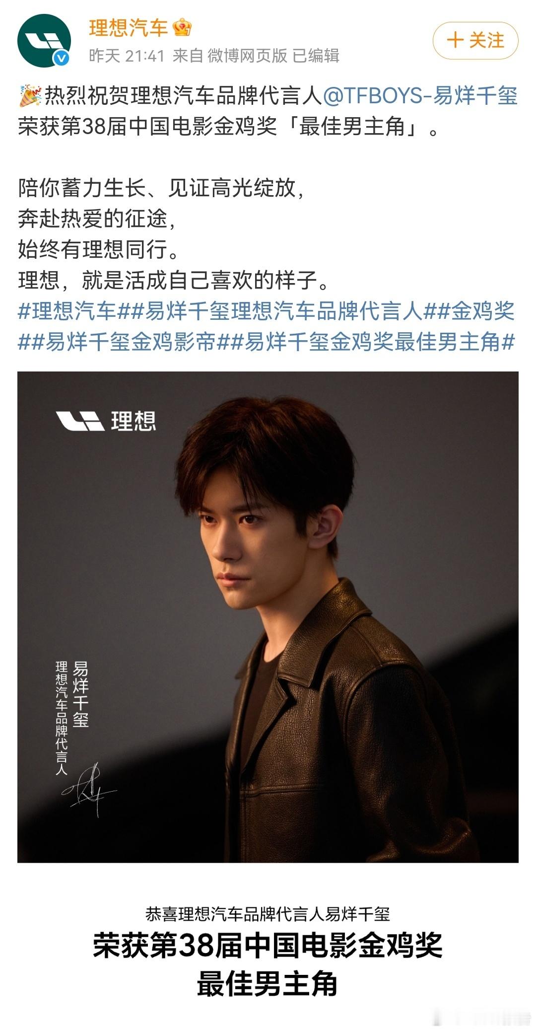 11月15日,理想汽车发布,热烈祝贺理想汽车品牌代言人 荣获第38届中国电影金鸡奖「最佳男主角」。陪你蓄力生长、见证高光绽放,奔赴热爱的征途,始终有理想同行。理想,就是活成自己喜欢的样子。
