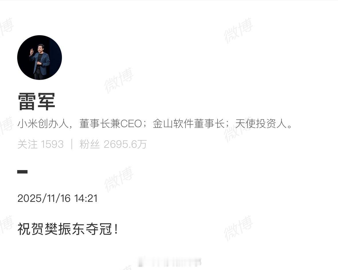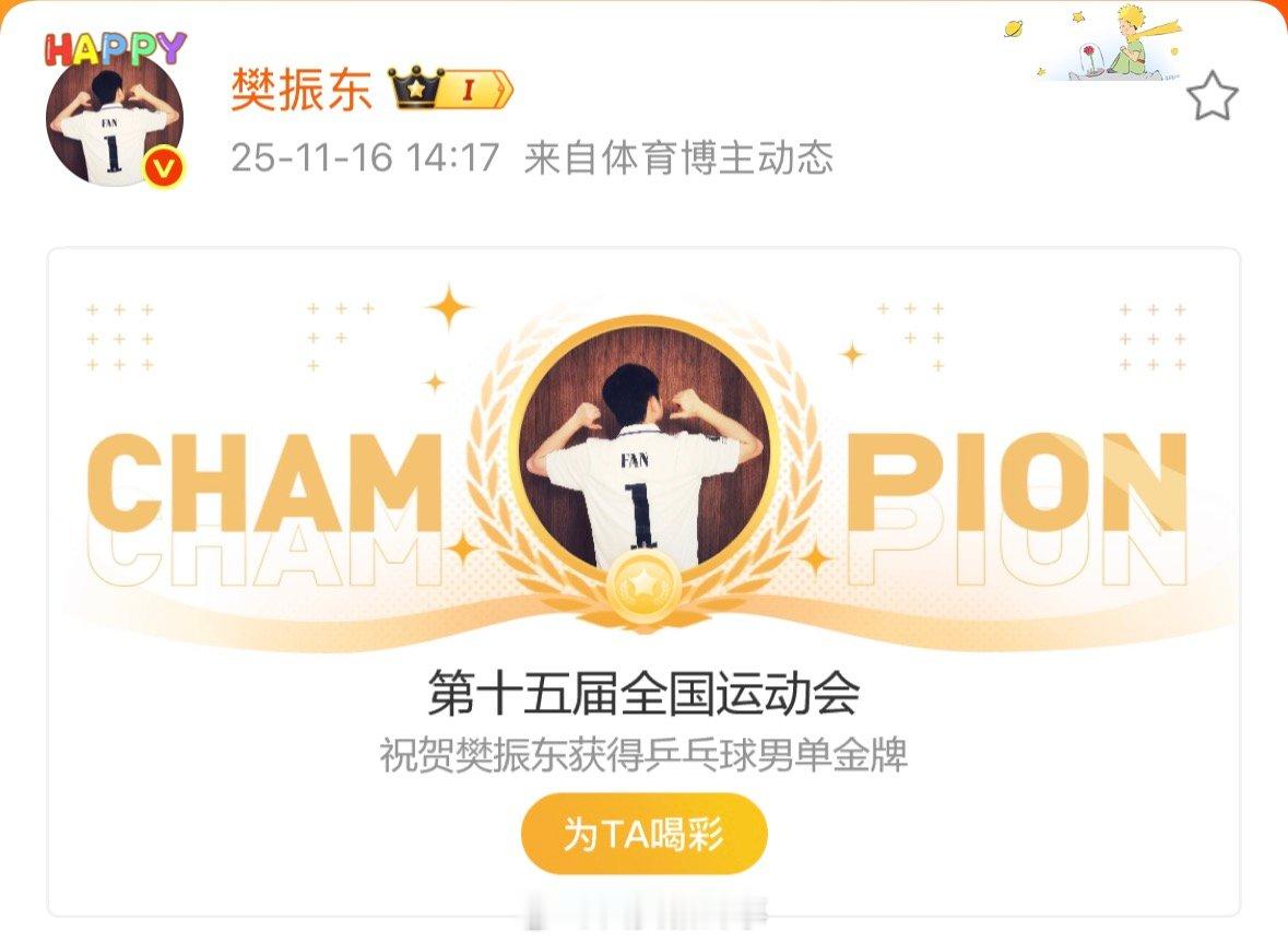 【】11月16日,第十五届全运会男单金牌赛,樊振东vs林诗栋,上海队 4-1战胜海南队 ,五局比分为:11-9、8-11、11-5、11-3、11-4。樊振东也成为继马龙后全运乒乓第二位卫冕男单冠军的人。随后, 发文祝贺樊振东全运会夺冠。