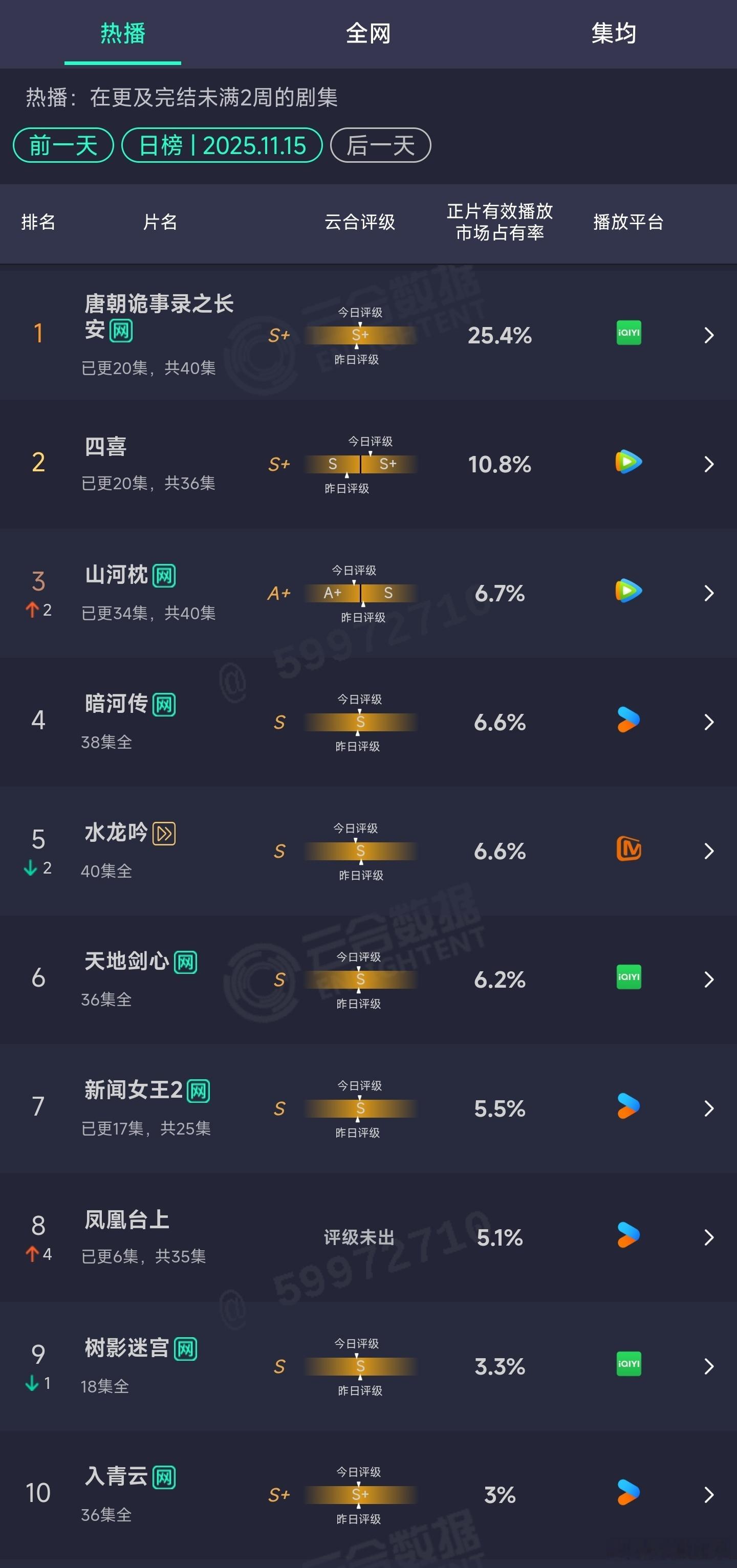 11.15竖短云合和红果热播榜:初次尝鲜8730万云合登顶。千金谋8428万热度
