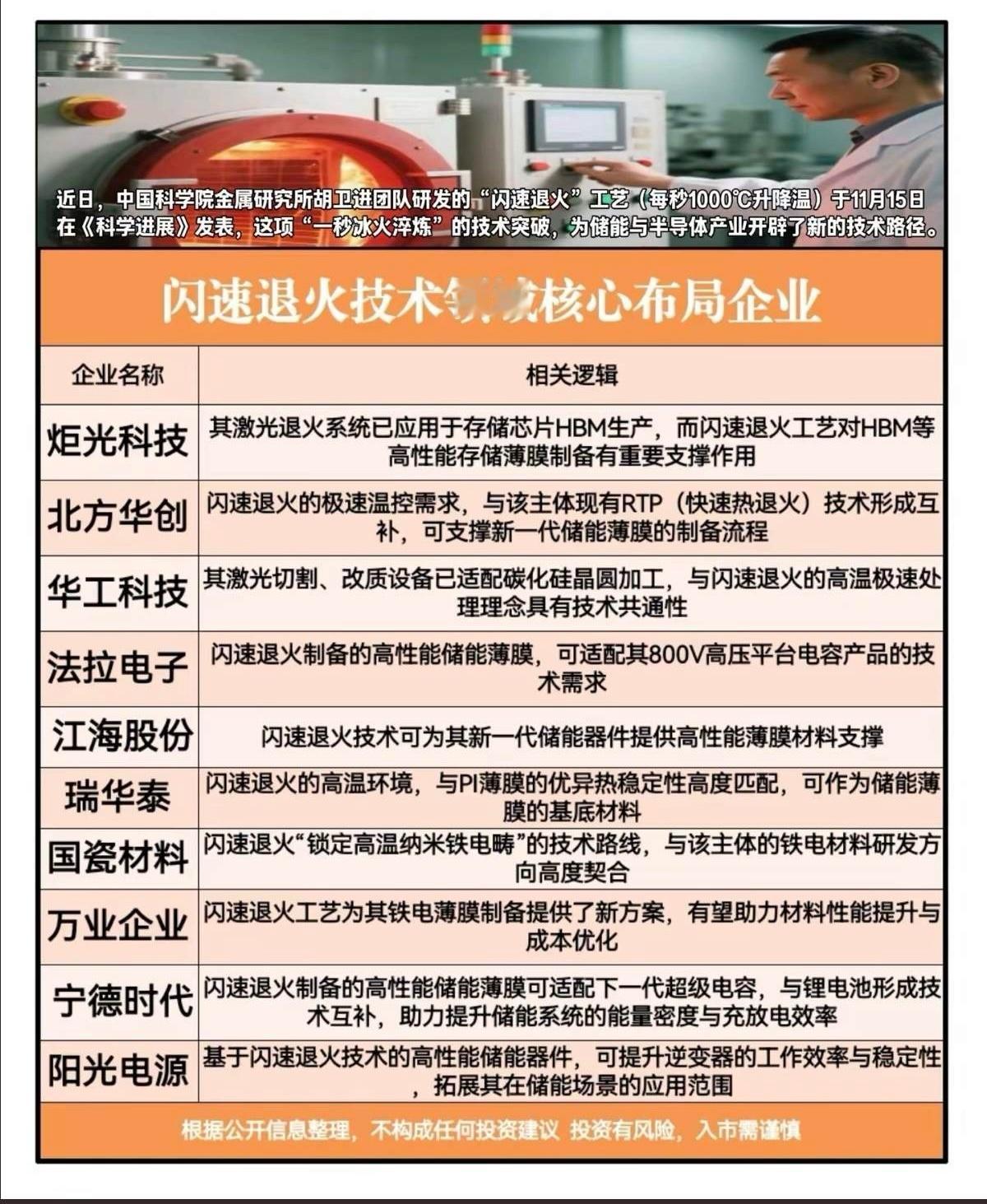 突破!闪速退火技术:领域核心龙头股!为储能与半导体产业开辟了新的技术路径!近日,中国科学院金属研究所胡卫进团队研发的“闪速退火"T艺(每秒1000C升降温)于11月15日在《科学进展》发表,这项“一秒冰火淬炼”的技术突破。