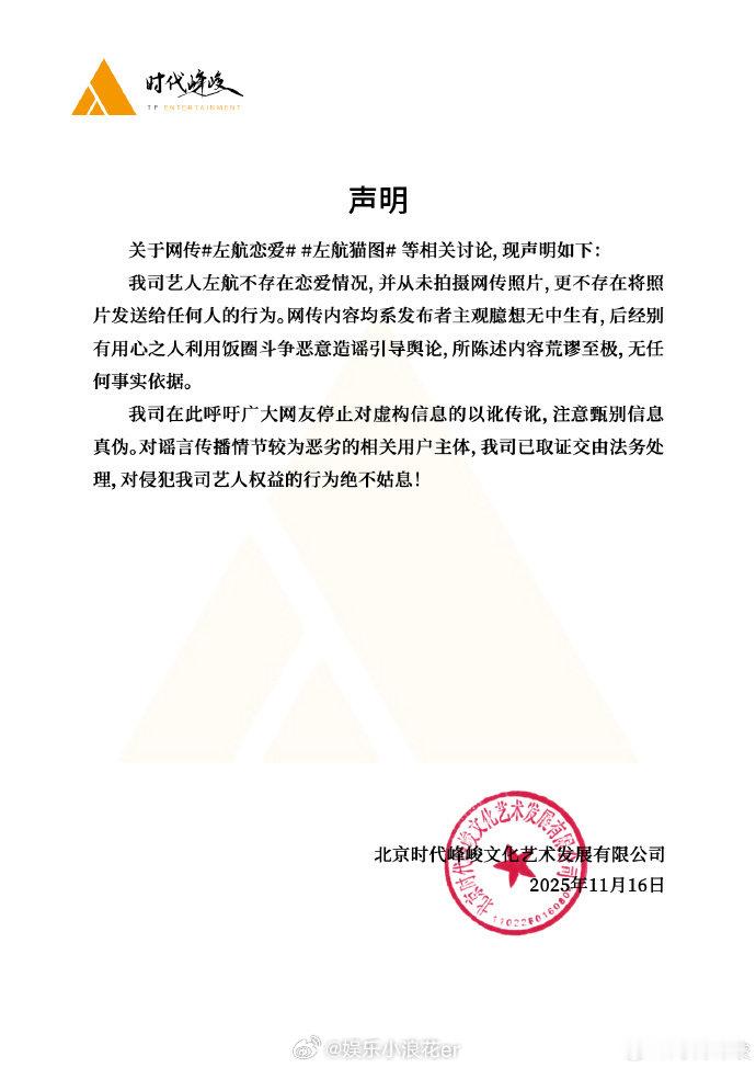 近日,网传引发热议。对此, 发严正声明,称左航不存在恋爱情况,“网传内容均系发布者主观臆想无中生有”,呼吁停止对虚构信息以讹传讹,已对谣言传播情节恶劣者取证。