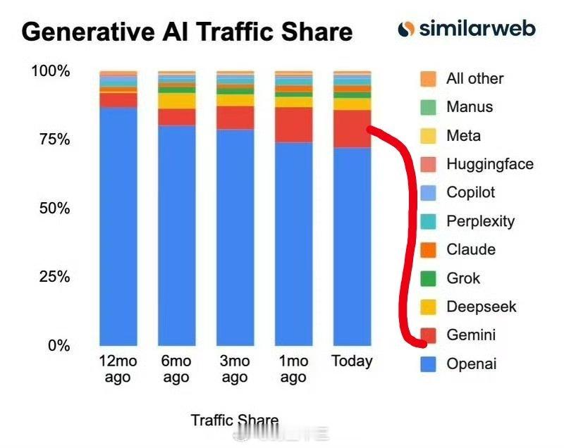 巴菲特,买了谷歌的股票!!那谷歌的ai到底好不好用?谷歌的Gemini,如图,鳄鱼十三手动画了一个连线!谷歌gemini表现出最强劲的增长势头,市场份额从5.6%稳步上升至13.7%,成为除ChatGPT外首个突破10%份额大关的AI聊天工具。生成式AI流量份额现状与趋势ChatGPT: 72.3% Gemini: 13.7% DeepSeek: 4.2%Grok: 2.5% Claude: 2.4%Perplexity: 2.3% Copilot: 1.2%根据2025年11月的最新报告,ChatGPT的市场份额已从一年前的86.6%下降至当前的72.3%。