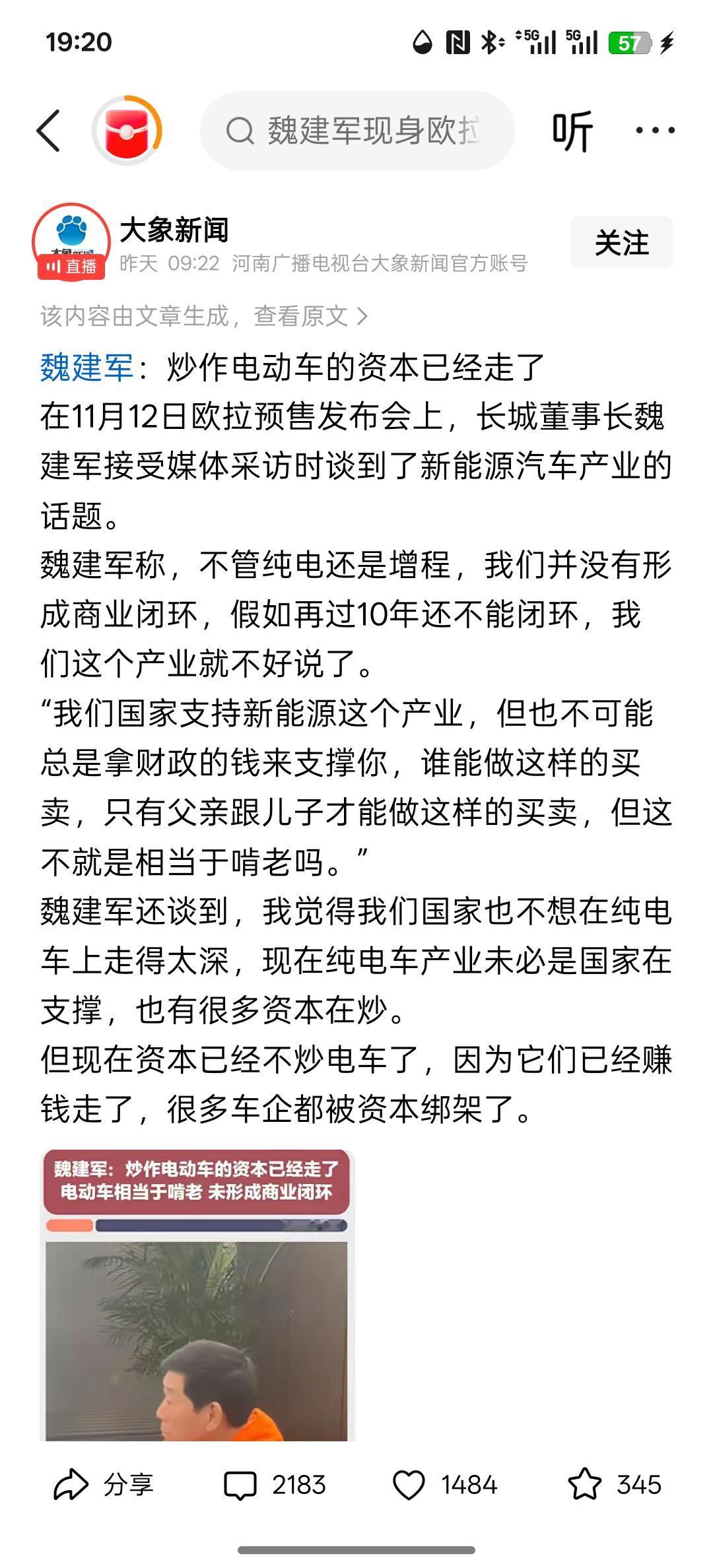 魏建军:炒作电动车的资本已经走了,搜索国家有点不想在电动汽车发展的领域走的太深!我们没有形成商业闭环! 但我觉得我们在电动车领域发展已经形成了商业变化,我们在新能源汽车发展有绝对的优势!这国家的战略发展,新能源汽车依然是国家的主要战略目标。智能汽车时代是燃油无法替代的!因为必须走向电气化!由现在的人形机器人,它必然会走向电动化,不可能走燃油货吧?所以我们在很多领域都要使用电池,那电动汽车同样在加快推动固态电池,那为什么不是新能源汽车?电气化时代! 现在内燃机以及石油,我们是没有主导权的,更没有定价权!每年要进口多少石油?中国不缺电,电动车发展依然是中国的主要战略目标!