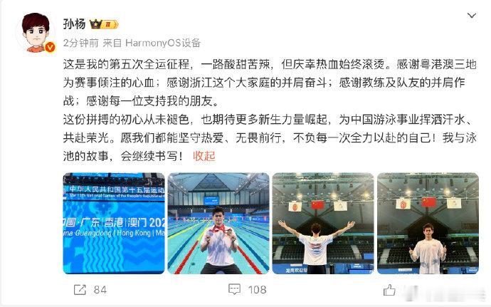 结束了全运会所有比赛的 发博 :这是我的第五次全运征程,一路酸甜苦辣,但庆幸热血始终滚烫。感谢粤港澳三地为赛事倾注的心血;感谢浙江这个大家庭的并肩奋斗;感谢教练及队友的并肩作战;感谢每一位支持我的朋友。这份拼搏的初心从未褪色,也期待更多新生力量崛起,为中国游泳事业挥洒汗水、共赴荣光。愿我们都能坚守热爱、无畏前行,不负每一次全力以赴的自己!我与泳池的故事,会继续书写!