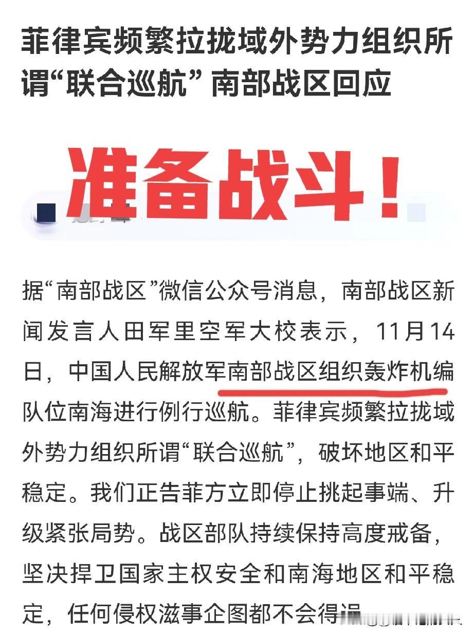 小二,上酒嘞![捂脸] 咱们要放弃幻想,准备战斗? 看看我们这几天南部战区轰炸机编队在南海进行例行巡航,菲律宾在嘚瑟的话,飘在海上那几艘船就是未来我轰炸机的目标,几发导弹下去就是有的导弹打不准,那海浪也能把那船小船给掀翻吧?[捂脸]