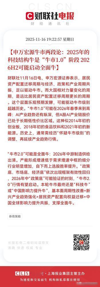 2015年那样的全面牛要来了!期待吗? 大家对近期的A股真是有又恨,一买就跌,一卖就涨!完全就是跟自己做对啊!也找不到主线,之前科技也不行了!市场进入混沌期! 这种行情确实让人头疼。 指数来回晃,热点切换快得像走马灯。 别说新手,老股民也容易踩错节奏。 最近市场有两个现象特别明显。 一个是上证指数顶背离反复出现。 技术派的人都在说,这信号历史上往往对应着震荡或回调。 另一个是AI硬件这类科技股,之前涨得太猛了。 现在外围有看空声音,板块整体回调压力不小。 有人甚至预测平均要跌三成。 科技股一歇菜,指数就难有起色。 光靠银行石油这些权重硬拉,也撑不住场面。 所以指数在某个区间反复磨底,也不意外。 但跌多了未必是坏事。 调整充分了,后面行情反而更健康。 有机构提到2026年下半年可能迎来全面牛。 这个时间点挺有意思。 毕竟经济复苏需要周期,政策效果也需要时间沉淀。 历史上有过类似的阶段。 比如2013年到2014年,市场也是反复磨底。 很多人熬不住走了,结果错过后面的大行情。 现在或许又到了考验耐心的时候。 别被短期波动带偏了。 控制仓位,留足子弹,机会来了才能抓住。 投资终究是反人性的游戏。 恐慌和贪婪都要不得。 静下心来,跟踪基本面扎实的标的。 跌出空间了,反而是机会。 行情总在绝望中诞生,在半信半疑中成长。 这话老套,但理不糙。 相信时间的力量。 用平常心对待波动,用长远眼看待市场。 这才是普通投资者最该练的内功。 MCN双量进阶计划