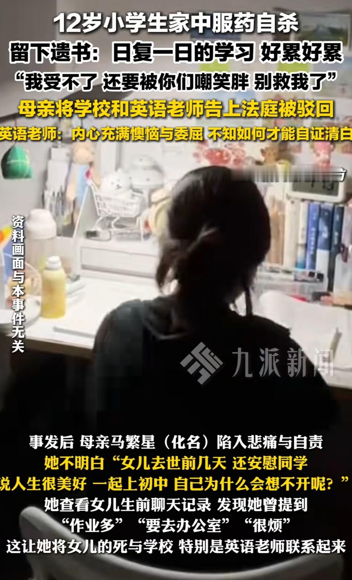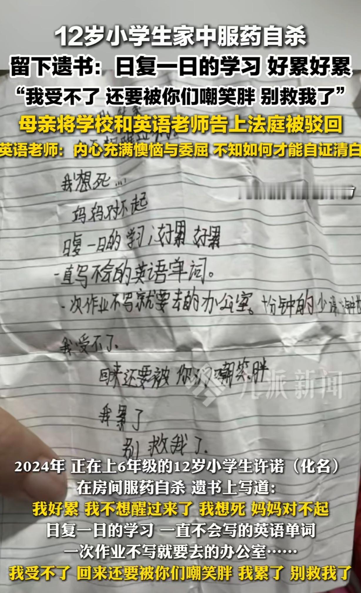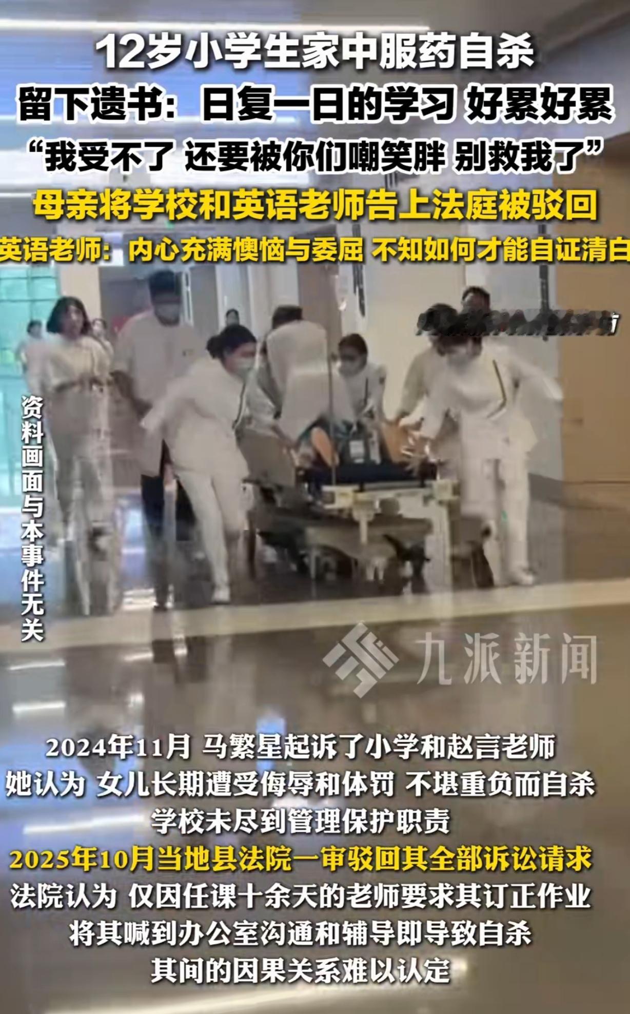 江苏,一上小学6年级的12岁女孩,在家服药自杀,留下遗书说:日复一日的学习好累,一直不会写的英语单词,一次作业不写就要去办公室,回家还被你们嘲笑胖,别救我了…女孩母亲崩溃大哭,认为女儿遭受侮辱和体罚,才想不开,愤怒的把学校和英语老师告上法庭,而英语老师才教了10多天的课,她一肚子委屈并辞职,她从今以后再也无法坦然面对学生了,心里有阴影了。法院的判决让人意想不到。 马女士离婚后,带着12岁的女儿,搬到了村里父母家居住。 2024年的一天晚上,在外地医院治疗阑尾炎的马女士,接到父亲的电话,父亲声音哽咽,难掩悲痛,让她赶紧回家,说家里出事了,但却不说发生了什么事。 马女士以为母亲身体出了问题,心急火燎往回赶,路上,妹妹却发来信息,暗示事情和她女儿有关,马女士的心一下子提到了嗓子眼。 因为女儿感冒了,引发肠胃炎还输了液,难道女儿的病严重了? 可她说什么都没想到,女儿竟然留下遗书,吃了母亲治疗心脏病的100粒药自杀了。 母亲听到二楼传来“扑通”的声音,上去一看,外孙女许诺趴在了地上。 母亲以为外孙女睡着了,可她抱起孩子,想把她放在床上,却发现她脸色青紫,又在垃圾桶里找到了空药瓶,在桌子上发现了遗书,才出大事了。 马女士心急火燎赶回家,对于马女士来说,那天是她生命中最晦暗的日子,她走进女儿许诺的房间,眼前的一幕,让她的世界瞬间支离破碎。 只见女儿安静的睡在床上,她留下一封遗书,结束了自己12岁的生命。 马女士眼前一黑,差点昏厥,她颤抖着双手打开了女儿的遗书,眼泪就像断了线的珠子,低落在遗书上,内心的愤怒也升腾起来。 女儿在遗书里,告诉她自己轻生的原因,是觉得日复一日繁重的学习,让她不堪重负,怎么努力都记不住的英语单词,一次没完成作业,就被叫到办公室,回家还被父母嘲笑太胖了…她真的受不了了,就想一睡不醒,要求父母别救她了… 短短数语,像一记重锤,敲打着马女士的心,她认为自己找到了女儿轻生的原因,那就是被英语老师侮辱和体罚了,女儿承受不住压力,才走上了不归路。 就在案发当天中午,她还接到了女儿的电话,女儿还嘱咐她注意身体,原来这是跟自己告别。 女儿前几天还在安慰同学,说生活很美好,她们努力学习,一起考进同一所初中,她之所以这么做,肯定是受到了她无法承受的伤害。 女儿才过了12岁生日6天呀,她是一朵含苞欲放的花朵,还没绽放就枯萎了,让她怎么接受得了? 马女士把矛头指向学校和女儿的英语老师赵言。 赵言从许诺班主任电话里得知她轻生的消息,脑袋瓜子嗡嗡作响。 因为班主任告诉她,说许诺的遗书里,提到了英语单词不会写,作业没完成就被叫到办公室。 赵言心里咯噔一下,预感到自己摊上事了,可她委屈不已,她才任教一个月而已,恪尽职守,教书育人,没有过分之举,把许诺叫到办公室,是和颜悦色跟她沟通,并单独辅导,这事跟自己没关系。 可马女士不这么认为,女儿轻生后,她奔走相告,一年后,她愤怒的把学校和赵言告上法庭。 而事情发生后,赵言心里充满恐惧,无法坦然面对学生,已经辞职,离开了那所小学,因为她不知道如何自证清白,更没办法站在那个讲台上,她看到许诺曾经坐过的位置,就心跳加速。 看来,老师也不需要对孩子单独辅导了,任何单一接触都是给自己埋雷啊!可悲可怜!活着咋这么难! 有和我一样建议取消英语的吗,谁爱学谁就学,数理化学好才是重点!为什么要迫着学英语呢?多少人一辈子都用不了,浪费精神时间? 英语学习,孩子从小付出那么多,有那么重要吗?长大有几个从事这个专业?把这个精力用于学母语不更好吗? 现在的孩子大多是“温室里的花朵”,被极度“富养”,哪经得住些许风吹雨打?个人观点首先要降低义务教材的难度,注重基础知识,不出难题偏题怪题,其次要加强体育锻炼和挫折教育,培养孩子们的心理素质,增强克服困难的。意志和毅力。 孩子的离世,让人痛心啊!正是花一样的年纪,导致悲剧发生是各种原因综合作用,长时间的积累造成的的。 《民法典》第1165条第1款规定:行为人因过错侵害他人民事权益造成损害的,应当承担侵权责任。 本案核心争议在于教师行为与自杀结果是否存在法律上的因果关系,以及学校或教师是否构成侵权。 法院认为,英语教师在十余天任教期间要求学生订正作业、单独辅导的行为,属于正常教育管理职责范畴,符合教学规范。 教师不存在体罚、侮辱或其他违法教育行为,如谩骂、殴打等,主观上无侵害学生权益的故意或重大过失。 原告主张的“心理压迫”缺乏客观证据支持,无法证明教师行为超出合理教育限度。 女孩轻生是多重压力,学业负担、家庭嘲笑体重、心理健康问题,共同作用的结果,遗书内容表明家庭环境亦是直接诱因,如“回家被你们嘲笑胖”。 法院认为,赵言短暂辅导行为与自杀结果之间没因果联系。驳回了马女士的诉求。 关注@灋律盐究员 学法辩是非,用法止纷争。