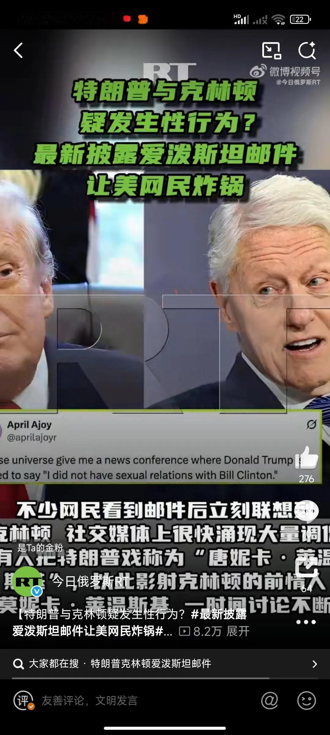 这条美国瓜有点儿劲爆了。 近日,美国国会委员会公布了一批杰弗里·爱泼斯坦相关的邮件,好奇的美国民众一拥而上,并在其中一个邮件中,发现了一个巨大秘密!因为这个邮件涉及了特朗普。 邮件是爱泼斯坦的兄弟马克在2018年写的,内容是这样的: ——马克问爱泼斯坦: 俄罗斯总统普京是否掌握着特朗普对“Bubba”进行口部性行为(blowing Bubba)的照片。 “Bubba”是谁?美国人都知道,这是美国前总统比尔·克林顿在任时的绰号。 这回,美国人总算明白了为什么两普的关系会如此的和谐密切了。 虽然事后马克在接受采访的时候否认“Bubba”就是克林顿,但这一否认,反而增加了这封邮件的可信度,也就是确有其事。 目前白宫并未对此事做出回应,但我觉得这件事对特朗普的地位并不会带来任何的影响,因为就美国人的那点道德高地,这算什么呢!