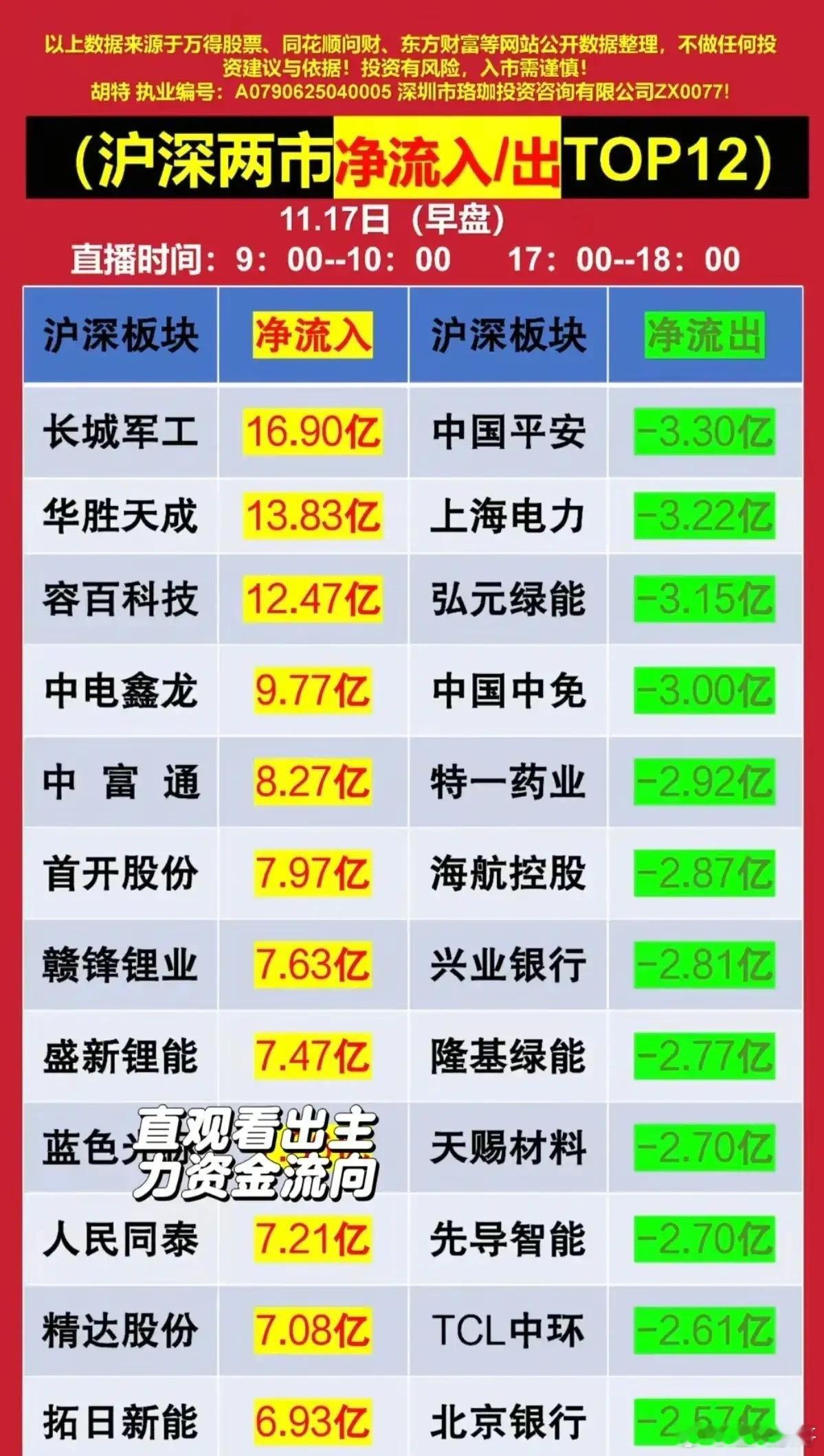11月17日早盘沪深两市资金净流入/流出TOP12梳理分析!今天资金净流入集中在军工、科技、新能源等题材赛道,净流出覆盖大金融、消费、电力等权重或前期热门标的,体现短期资金偏向活跃题材,对权重及部分赛道标的暂呈撤离态势,需注意资金情绪的短期性。个股梳理净流入个股1. 长城军工:军工赛道标的,聚焦弹药装备业务,早盘获资金关注,贴合军工板块短期热度,资金流入或源于行业需求与政策预期的催化。2. 华胜天成:覆盖AI算力、芯片、军工多概念,是题材叠加型标的,多赛道共振契合市场偏好,资金流入反映其在热点中的卡位优势。3. 容百科技:新能源材料标的,主营锂电池正极材料,贴合新能源赛道局部活跃,资金流入源于产业链需求的短期预期。4. 中电鑫龙:涉及电力设备领域,早盘获资金布局,或与其电力配套赛道属性及题材联动预期有关,跟随基建类细分标的热度。5. 中富通:通信技术服务标的,贴合通信板块短期活跃,资金流入或源于算力基建配套的通信服务需求预期。6. 首开股份:地产板块标的,获资金流入,或源于地产行业政策及区域项目预期,是资金对地产局部修复机会的布局。7. 赣锋锂业:锂资源及锂电核心标的,覆盖固态电池、储能方向,贴合新能源主线,资金流入反映对锂资源与新电池技术的关注。8. 盛新锂能:聚焦锂资源开发与锂电材料,同属新能源赛道,资金流入与锂资源价格及产业链需求的短期预期相关。9. 蓝色光标:AI应用端标的,涉及AI出海+广告营销,贴合AI应用落地热点,资金流入源于场景拓展的预期催化。10. 人民同泰:医药商业标的,获资金流入,或源于医药板块局部情绪修复,以及自身业务的短期预期。11. 精达股份:主营电磁线产品,涉及新能源、军工配套,是细分领域标的,资金流入源于多赛道配套需求预期。12. 拓日新能:光伏赛道标的,贴合光伏板块短期活跃,资金流入源于新能源能源转型的需求预期。净流出个股1. 中国平安:大金融权重标的,遭资金流出,或源于市场对大金融短期景气度的谨慎,以及资金向题材赛道的切换。2. 上海电力:电力板块标的,遭资金流出,与电力板块短期热度退潮有关,资金暂撤离前期活跃的电力赛道。3. 弘元绿能:光伏设备标的,遭资金流出,源于光伏板块内部分化,资金暂撤离部分高估值光伏设备标的。4. 中国中免:消费赛道核心标的,遭资金流出,源于消费板块短期情绪降温,资金向题材赛道转移。5. 特一药业:医药板块标的,遭资金流出,与医药板块局部分化有关,资金暂撤离前期活跃的医药标的。6. 海航控股:航空运输标的,遭资金流出,源于航空板块短期预期变化,资金暂撤离交通出行类标的。7. 兴业银行:大金融标的,遭资金流出,同其他金融股一致,是资金向题材赛道切换的体现。8. 隆基绿能:光伏权重标的,遭资金流出,源于光伏板块短期分化,资金暂撤离头部光伏标的。9. 天赐材料:锂电材料标的,遭资金流出,源于新能源赛道内部分化,资金暂撤离部分锂电材料标的。10. 先导智能:锂电设备标的,遭资金流出,同天赐材料类似,反映新能源赛道的资金分流。11. TCL中环:光伏标的,遭资金流出,源于光伏板块短期热度退潮,资金暂撤离该标的。12. 北京银行:大金融标的,遭资金流出,是资金向题材赛道切换的延续。