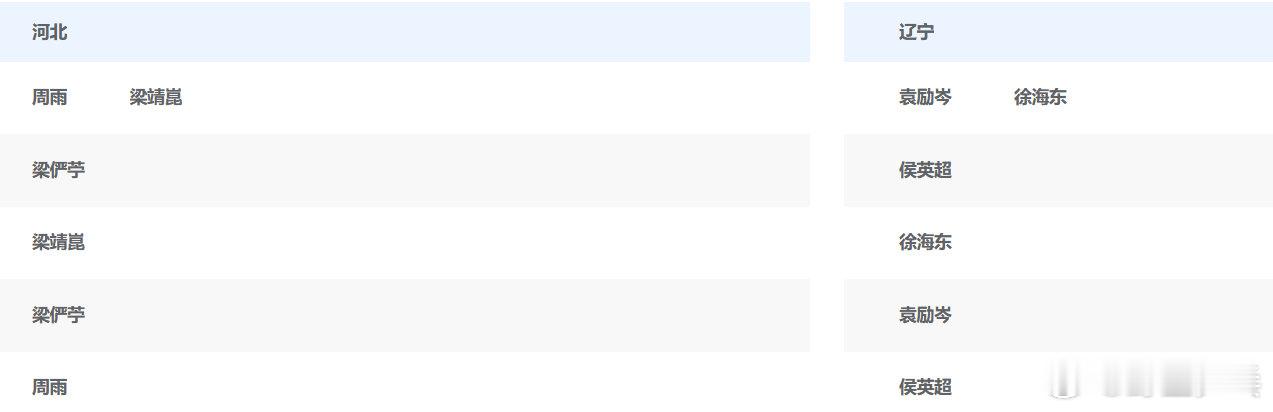 2025全运会乒乓球男团小组赛D组,河北vs辽宁出场阵容。第一盘:第二盘:梁俨苧vs侯英超第三盘:第四盘:梁俨苧vs袁励岑第五盘:周雨vs侯英超