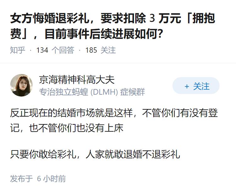 女方悔婚退彩礼,要求扣除 3 万元「拥抱费」,目前事件后续进展如何?