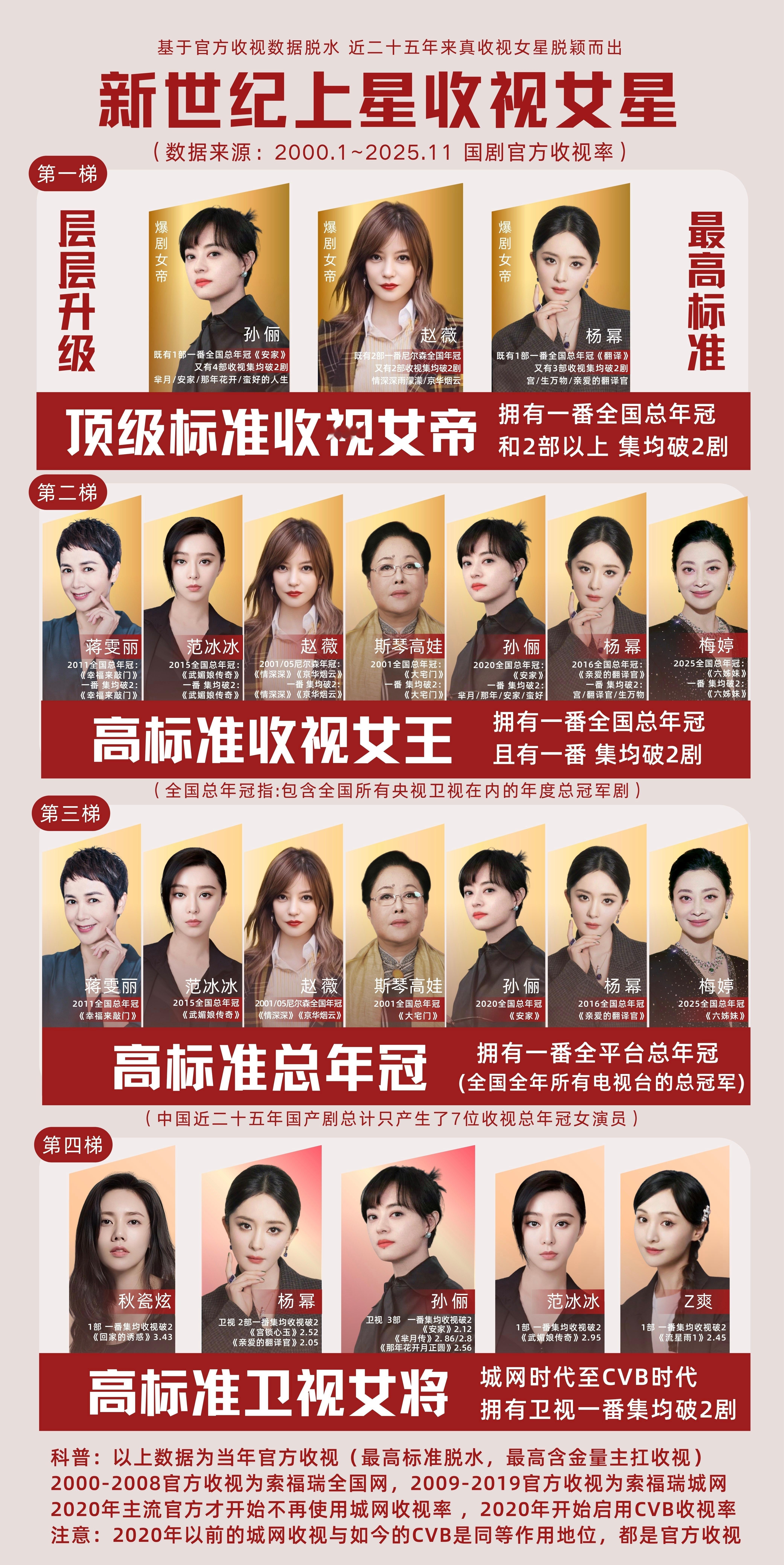 新世纪收视女王,上星收视真正高的女演员们。薇、孙俪、杨幂、蒋雯丽、范冰冰、梅婷、斯琴高娃老师等。