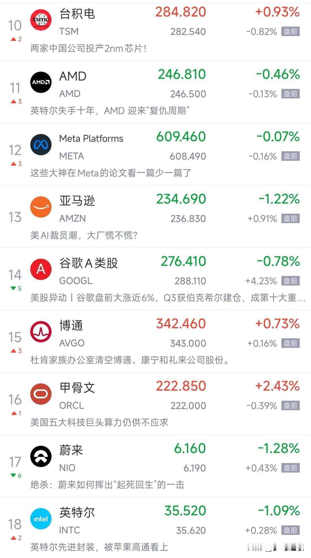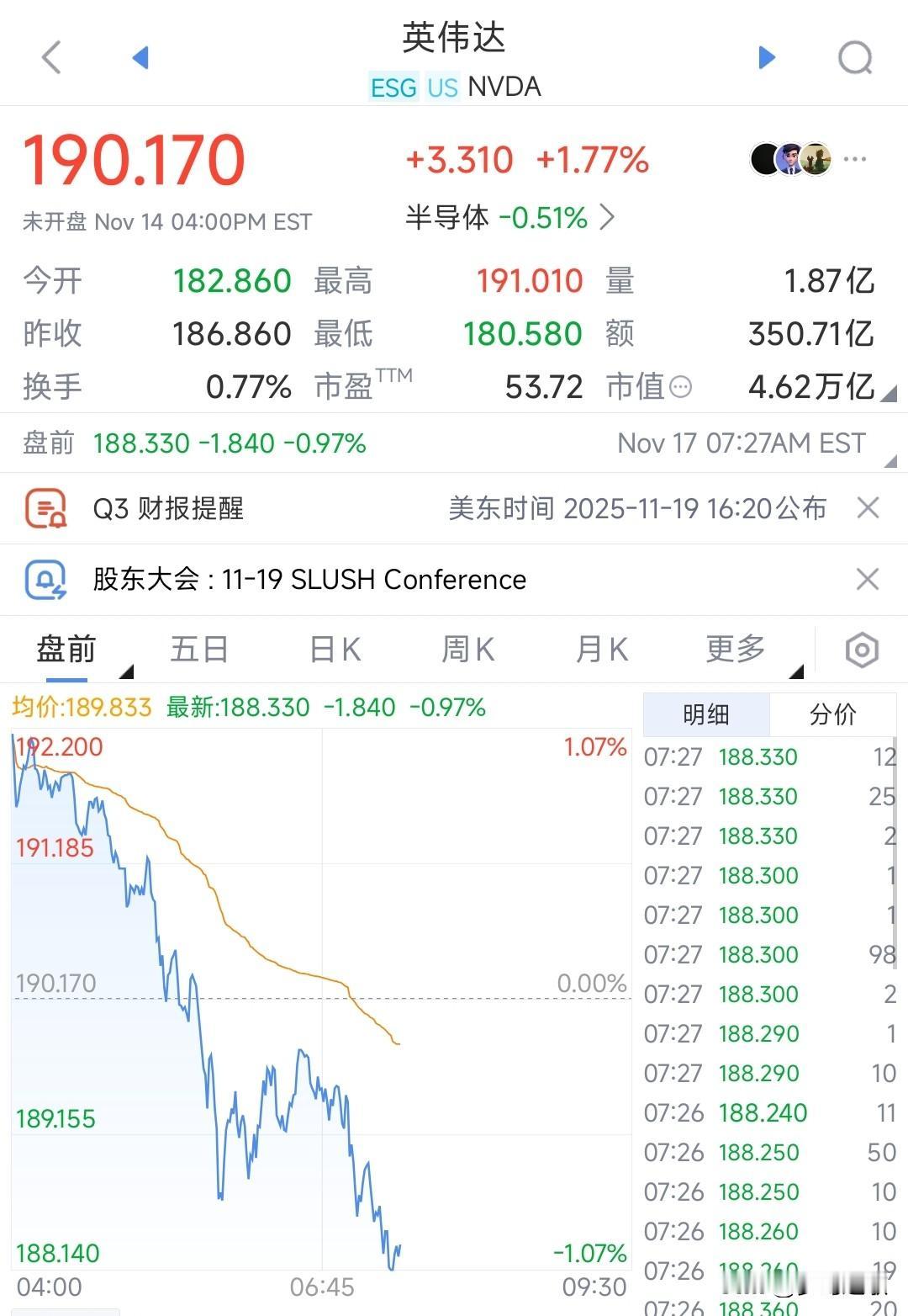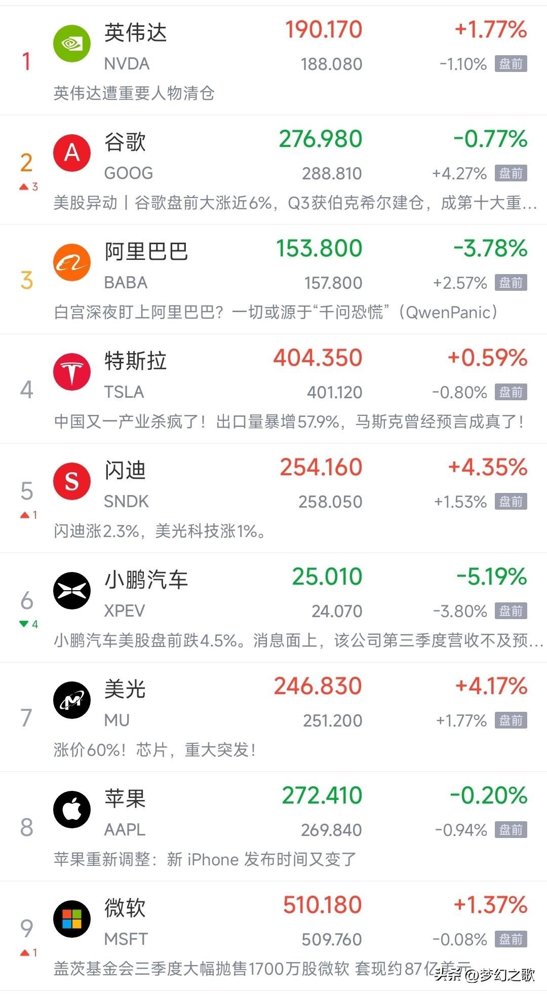 美股又开始跳水了,跟上周一样的剧本又来了 美股盘前三大指数又开始了跳水的走势,其中英伟达跳水最严重,从开盘上涨1%已经下落到了跌1%,这是非常不好的一个消息,预示在以人工智能为首的科技股又要开始跳水了。 目前特斯拉跌0.80%,苹果跌0.94%,几乎大型科技股都在跌,只有谷歌有超大利好消息,大涨4.27%。 在上周有机构预测美股将会最多回撤10%-15%,从现在的趋势看很有可能会预测成真,甚至跌15%都不会止跌的情况。 主要还是因为投资者已经开始不信任人工智能的支出情况了,一直在大额支出但回报却不尽人意。