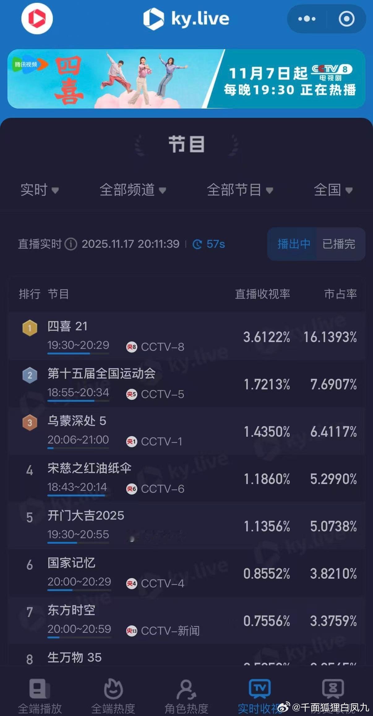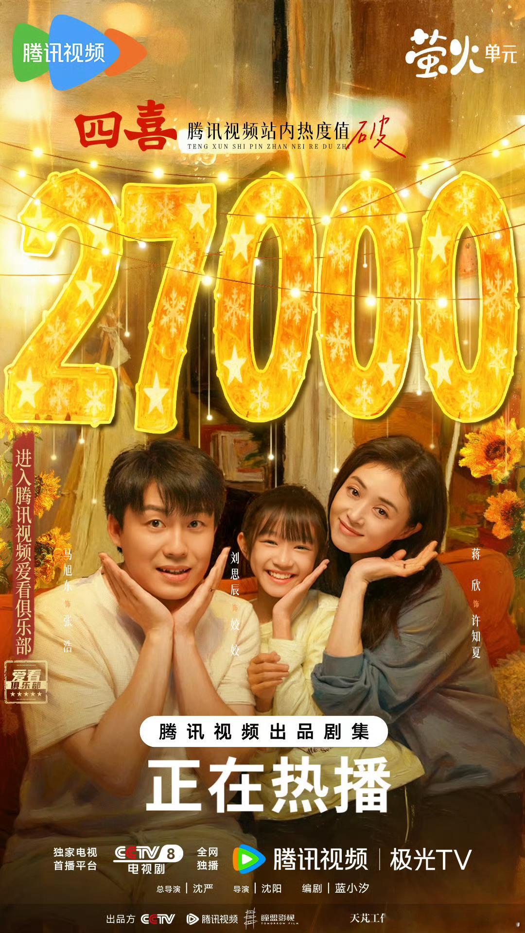 《四喜》太能打了,腾讯热度27457破萤火单元最高值,酷云收视率峰值破3.6%,台网双丰收实至名归,播期天天收视top1,温情+演技剧情真的无法拒绝!