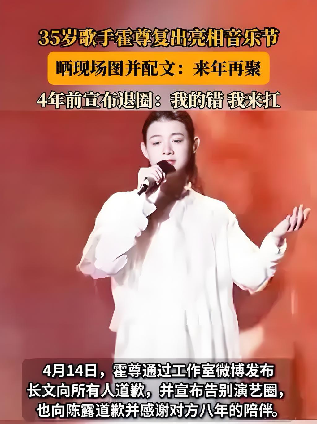【霍尊正式复出:南京音乐节完成演艺回归】 ▪ 时间:2025年11月16日 ▪ 事件:南京江豚音乐节压轴演出,连续演唱《卷珠帘》《天行九歌》等九首代表作。 ▪ 支持:现场粉丝同步点亮南京六大地标应援大屏,形成现象级应援。 ▪ 背景:继2023年拉斯维加斯及全国巡演试水后,此次为标志性复出首秀。 ▪ 动态:本人回应强调“愿意承担舆论压力”。 ▪ 商业布局:2024年已成立个人独资文化工作室,完成商业架构准备。