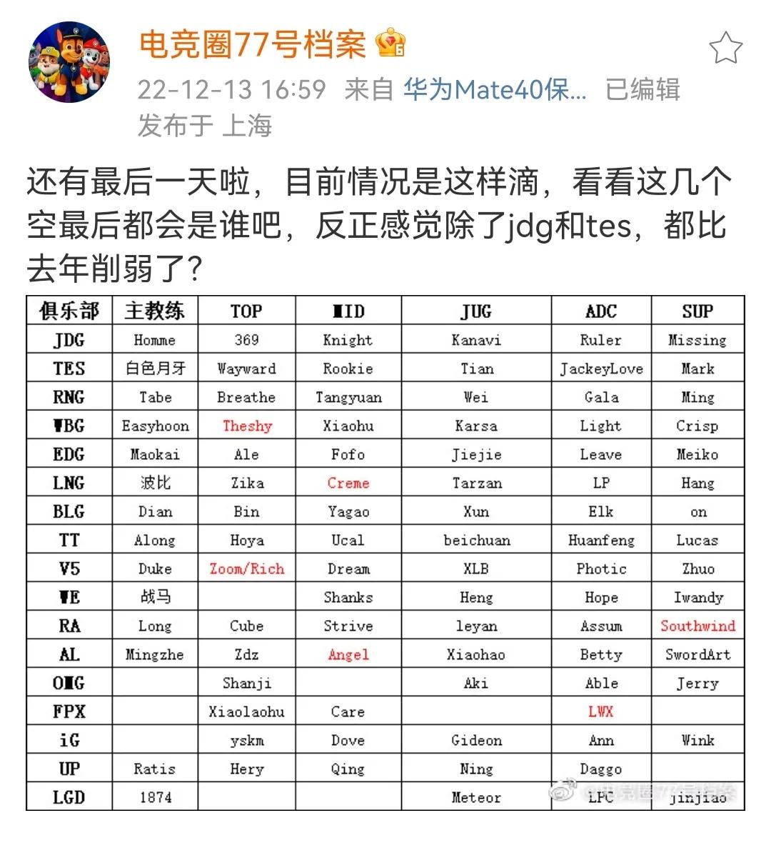 爆料人电竞圈77号,总结的LPL队伍转会期大名单! 明天14日,转会期就宣布结束了。JDG、TES、RNG、EDG、BLG、TT、RA这几支队伍,人员阵容都已经确定了。其他队伍,还有选手在拉扯当中。 EDG的中路是Fofo,而Scout也没有出现在该名单上,难道明年跟Doinb一样休息吗?LWX出去转了一圈,没有好去处,最后可能还是留在FPX。 大安老师微博发布求职信后,疑似得到了AL的招揽。那么绿毛呢?辅助位置,现在来看只有两个空位了,可以跟LWX一队,或者跟Ning王一队。