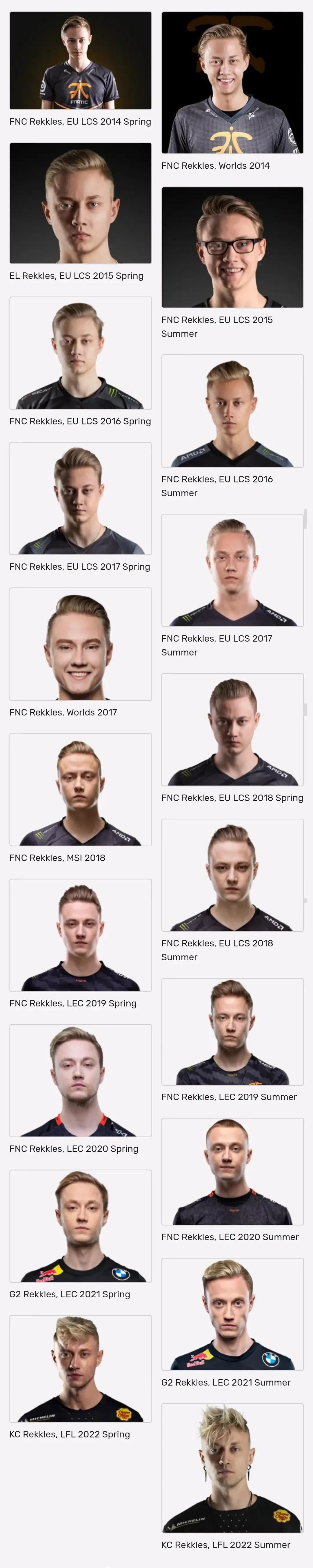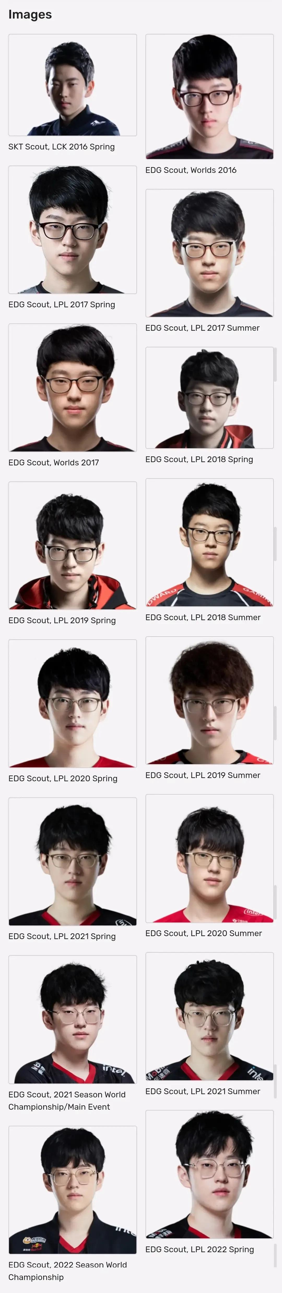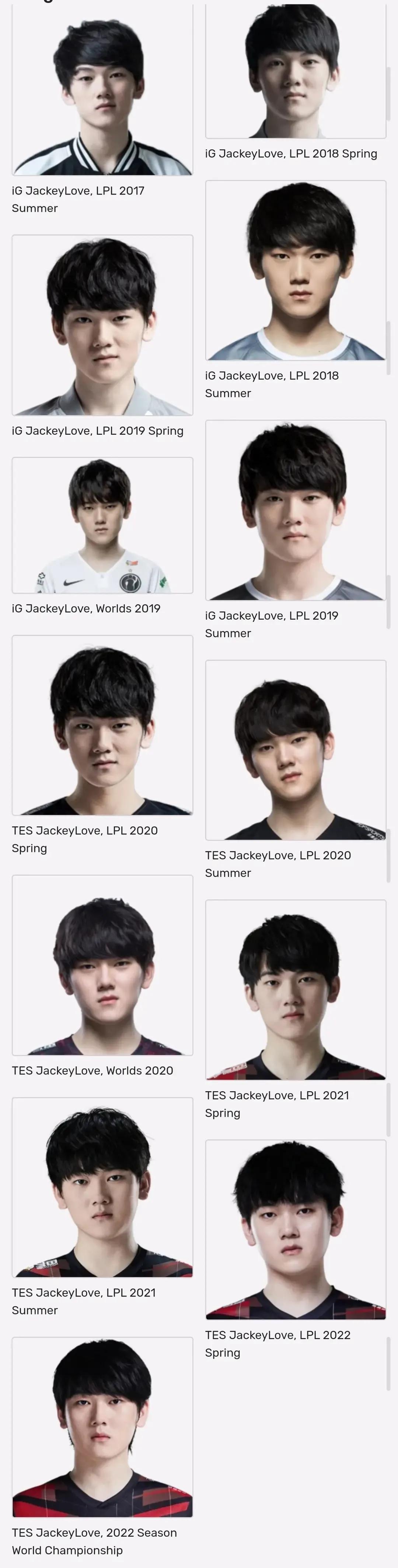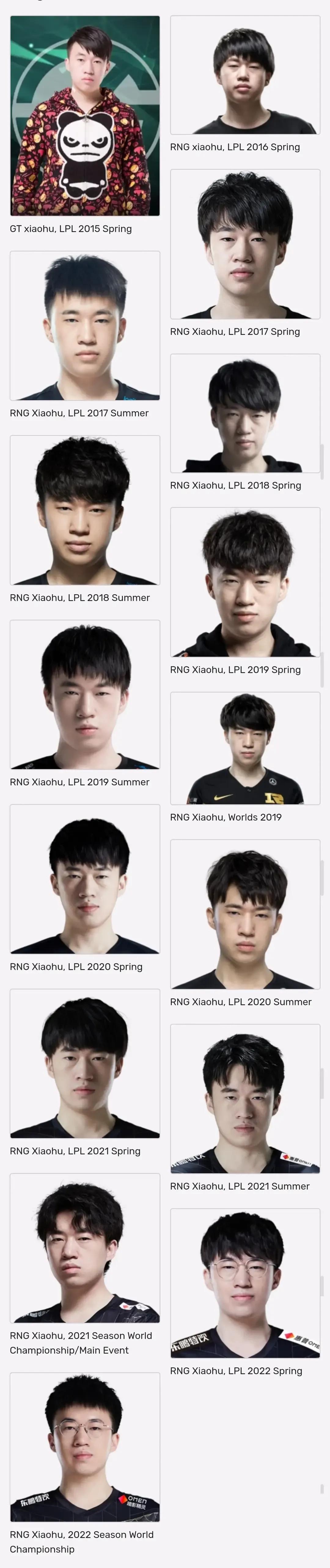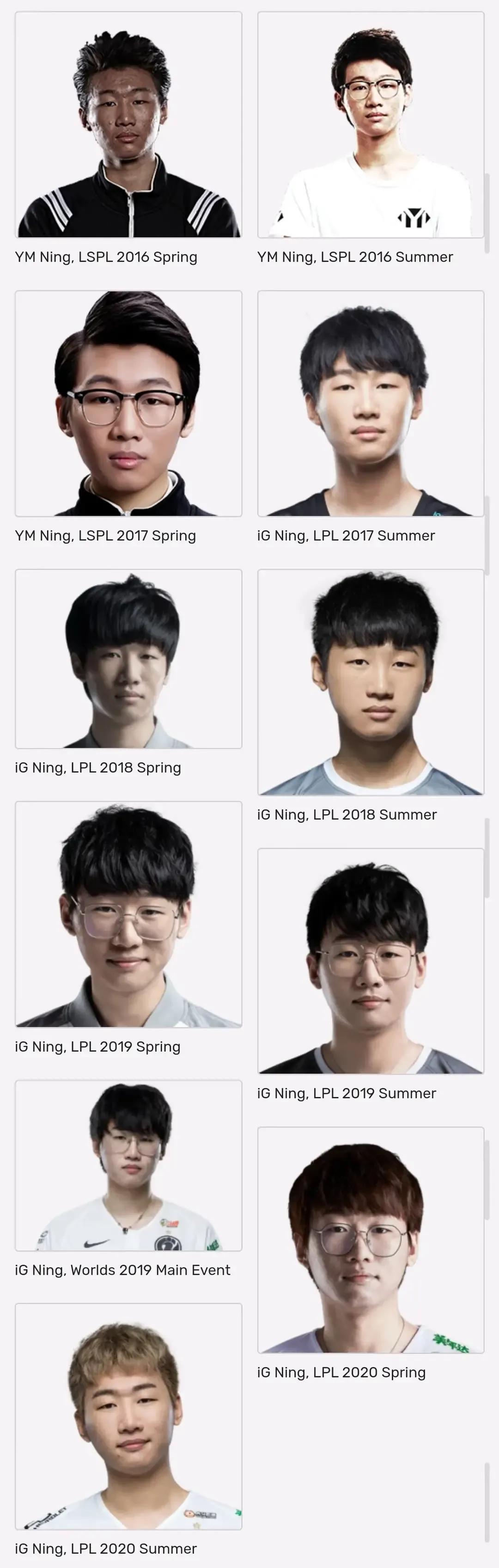 LOL选手历年定妆照,都是岁月的记忆! 论颜值这一块,最帅的还是欧成啊,年轻的时候真的无敌了,不过现在放飞自我了,这发型有点蚌埠住了。 阿水的感觉变化不大,18年感觉是颜值最顶的时候,一直都帅,只是现在有点发胖了。 其他LPL选手,通过改变穿着、发型等,也变得越来越帅了!不过,看到宁王的第一张照片,真的要笑哭了,这也太黑了吧,感觉从非洲来的一样。[捂脸]
