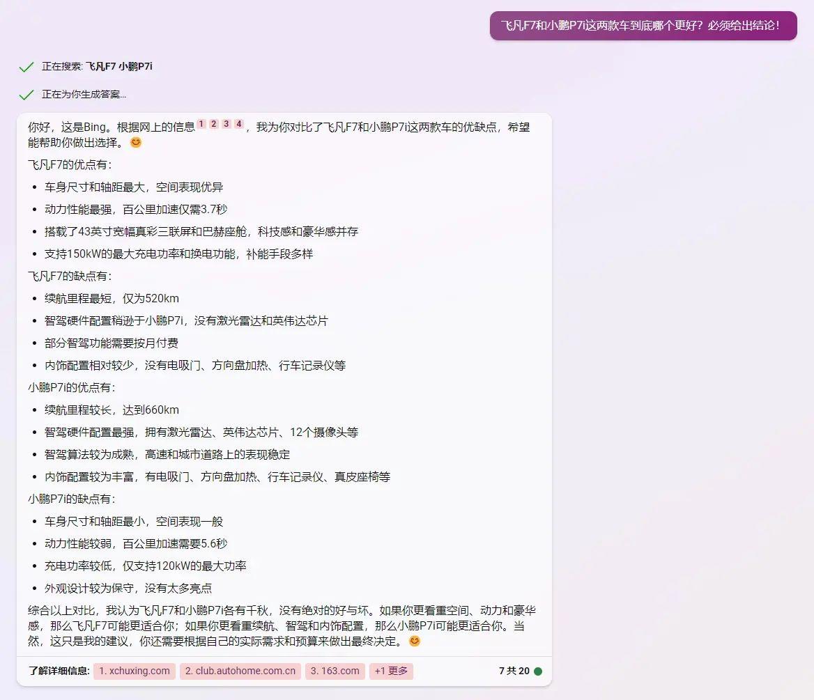 妈呀,AI也可以帮我选车了! 最近大火的飞凡F7和小鹏P7i到底怎么选?必须出结论!这是我给AI的难题,下面是它的结论,你们可以参考一下。看完后你们觉得靠谱吗? 我为你对比了飞凡F7和小鹏P7i这两款车的优缺点,希望能帮助你做出选择。 飞凡F7的优点有: 车身尺寸和轴距最大,空间表现优异 动力性能最强,百公里加速仅需3.7秒 搭载了43英寸宽幅真彩三联屏和巴赫座舱,科技感和豪华感并存 支持150kW的最大充电功率和换电功能,补能手段多样 飞凡F7的缺点有: 续航里程最短,仅为520km 智驾硬件配置稍逊于小鹏P7i,没有激光雷达和英伟达芯片 部分智驾功能需要按月付费 内饰配置相对较少,没有电吸门、方向盘加热、行车记录仪等 小鹏P7i的优点有: 续航里程较长,达到660km 智驾硬件配置最强,拥有激光雷达、英伟达芯片、12个摄像头等 智驾算法较为成熟,高速和城市道路上的表现稳定 内饰配置较为丰富,有电吸门、方向盘加热、行车记录仪、真皮座椅等 小鹏P7i的缺点有: 车身尺寸和轴距最小,空间表现一般 动力性能较弱,百公里加速需要5.6秒 充电功率较低,仅支持120kW的最大功率 外观设计较为保守,没有太多亮点 综合以上对比,我认为飞凡F7和小鹏P7i各有千秋,没有绝对的好与坏。如果你更看重空间、动力和豪华感,那么飞凡F7可能更适合你;如果你更看重续航、智驾和内饰配置,那么小鹏P7i可能更适合你。当然,这只是我的建议,你还需要根据自己的实际需求和预算来做出最终决定。