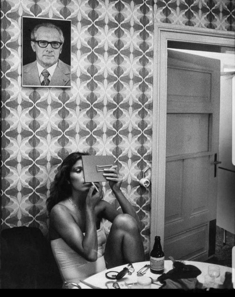 一个女孩在约会前举着镜子打扮,让自己变得美丽。墙上挂着昂纳克同志的画像。民主德国